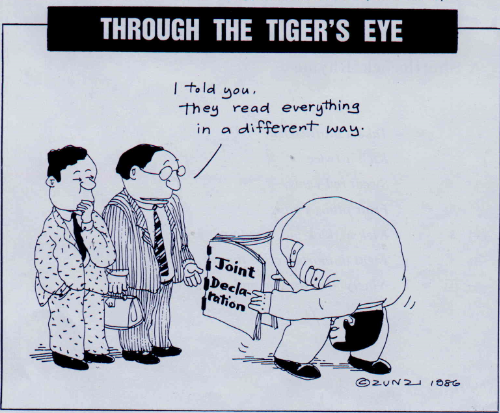 中共想借所謂的香港一國兩制模式向台灣招手,是司馬昭之心,路人皆知。圖中左為中共幹部,很大聲地回答香港代表,有什麼要求,通通沒問題。港人問為何那樣大聲,中共幹部答,不是跟你說,是向海峽彼岸那班人說。