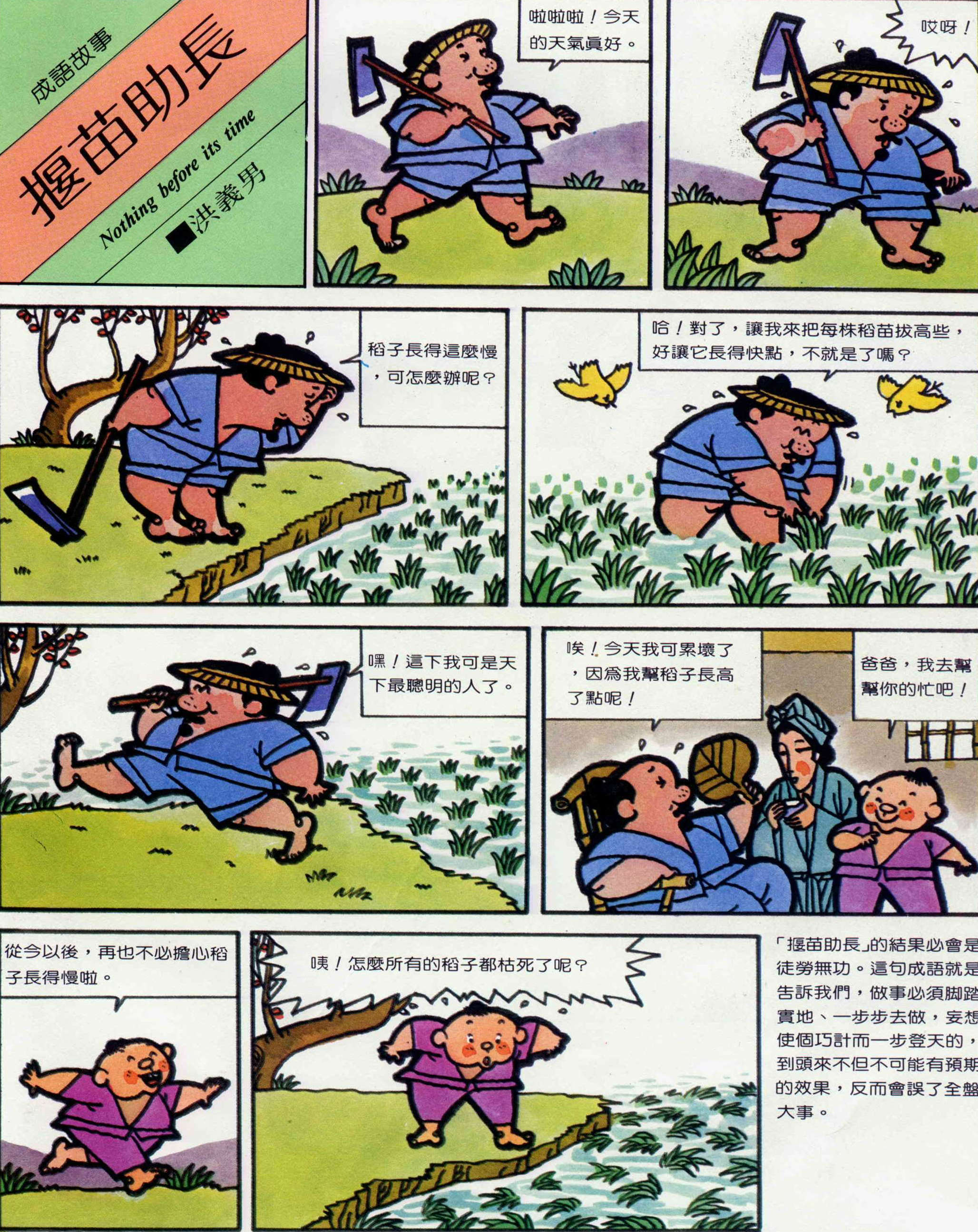 揠苗助長 文‧圖.洪義男 圖‧洪義男 1983 5月 EN 分享: 揠苗助長 ■洪義男啦啦啦!今天的天氣真好。哎呀!稻子長得這麼慢,可怎麼辦呢?哈!對了,讓我來把每株稻苗拔高些,好讓它長得快點,不就是了嗎?嘿!這下我可是天下最聰明的人了。唉!今天我可累壞了,因為我幫稻子長高了點呢!爸爸,我去幫幫你的忙吧!從今以後,再也不必擔心稻子長得慢啦。咦!怎麼所有的稻子都枯死了呢?「揠苗助長」的結果必會是徒勞無功。這句成語就是告訴我們,做事必須腳踏實地、一步步去做,妄想使個巧計而一步登天的,到頭來不但不可能有預期的效果,反而會誤了全盤大事。 啦啦啦!今天的天氣真好。 哎呀! 稻子長得這麼慢,可怎麼辦呢? 哈!對了,讓我來把每株稻苗拔高些,好讓它長得快點,不就是了嗎? 嘿!這下我可是天下最聰明的人了。 唉!今天我可累壞了,因為我幫稻子長高了點呢! 爸爸,我去幫幫你的忙吧! 從今以後,再也不必擔心稻子長得慢啦。 咦!怎麼所有的稻子都枯死了呢? 「揠苗助長」的結果必會是徒勞無功。這句成語就是告訴我們,做事必須腳踏實地、一步步去做,妄想使個巧計而一步登天的,到頭來不但不可能有預期的效果,反而會誤了全盤大事。 分享: