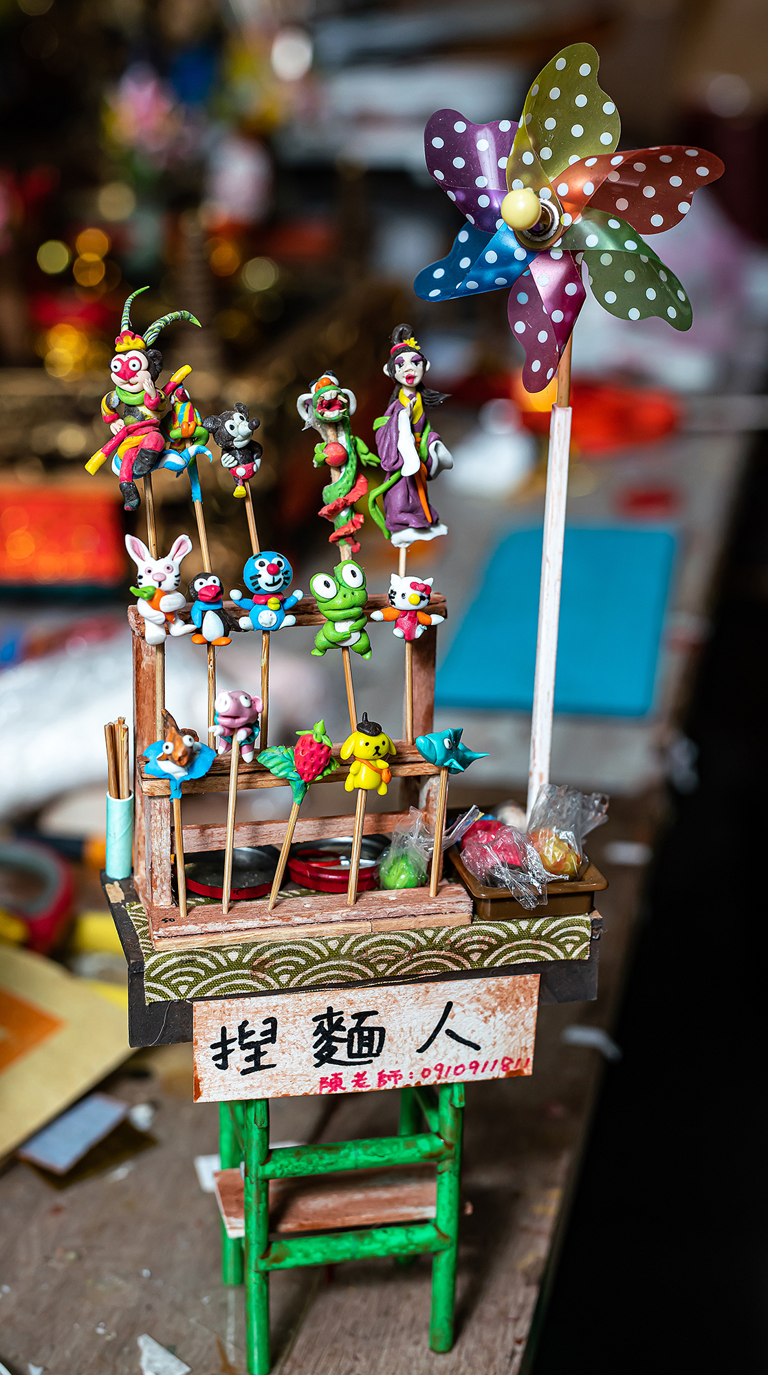 擺攤現場,客人指名款式,師傅臨場製作,為了搶快,捏麵人工藝只要簡單幾個步驟,就能將角色神態刻畫得維妙維肖,厲害的師傅,手法石火電光,神乎其技。