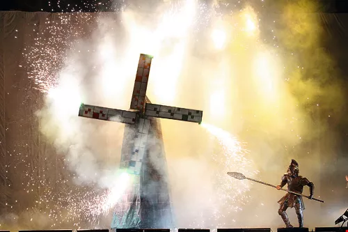 傍晚時分,大人牽著小孩陸續坐在星光下。舞台上,穿著金盔甲的唐吉軻德騎著馬出來,力抗高大的風車,不一會他發現原來自己對抗的敵人是一頭大魔龍;演著、演著,唐吉軻德會將魔龍趕下台,工作人員噴起乾冰,小朋友興奮地一起「打倒大魔龍!」每次演到這一幕,小朋友就超high,歡呼聲、笑聲縈繞夜空,久久不散。