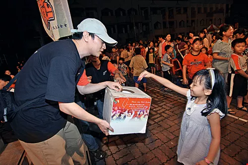 這是「孩子的第一哩路」,看到小孩子忘我的歡笑聲,就是紙風車的最大成就(左圖為台東綠島);現場還有小朋友大方捐出零用錢(右圖為台南下營)!