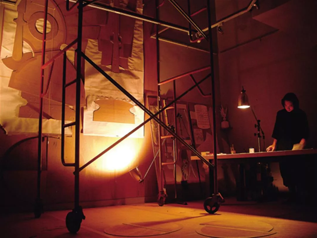設於桃園龍潭的「九座寮工作室」,挑高的空間適合創作大型作品,施宣宇在此耗費無限心神,常將自己的體能與精神逼到極限。