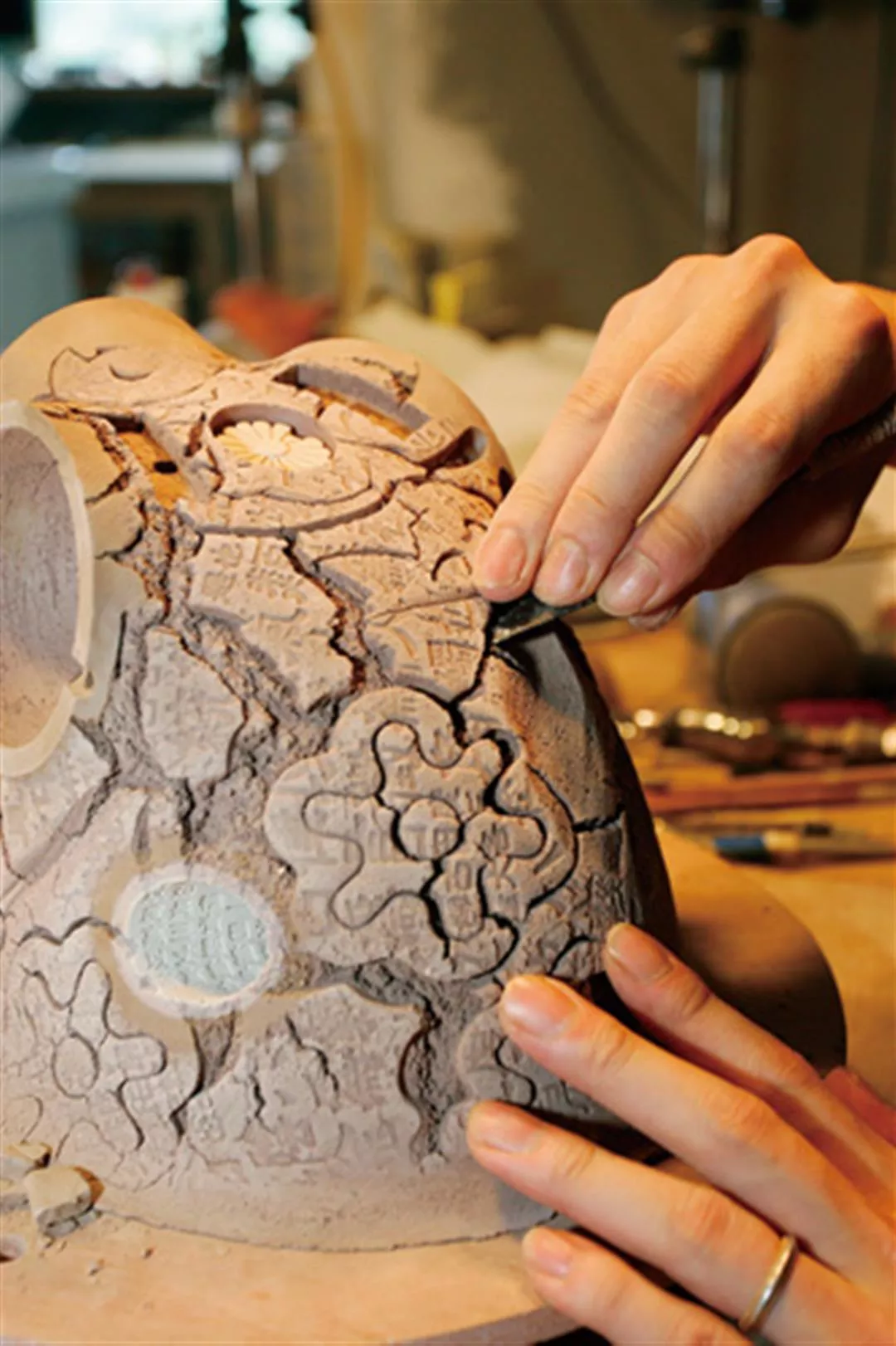 發現原因後,他想出「保溫」和「快速完成」兩大策略:儘量在一天之中完成,然後用吹風機將作品吹乾後儘快窯燒;如果實在趕不及,晚上就要幫作品「蓋棉被」保溫。