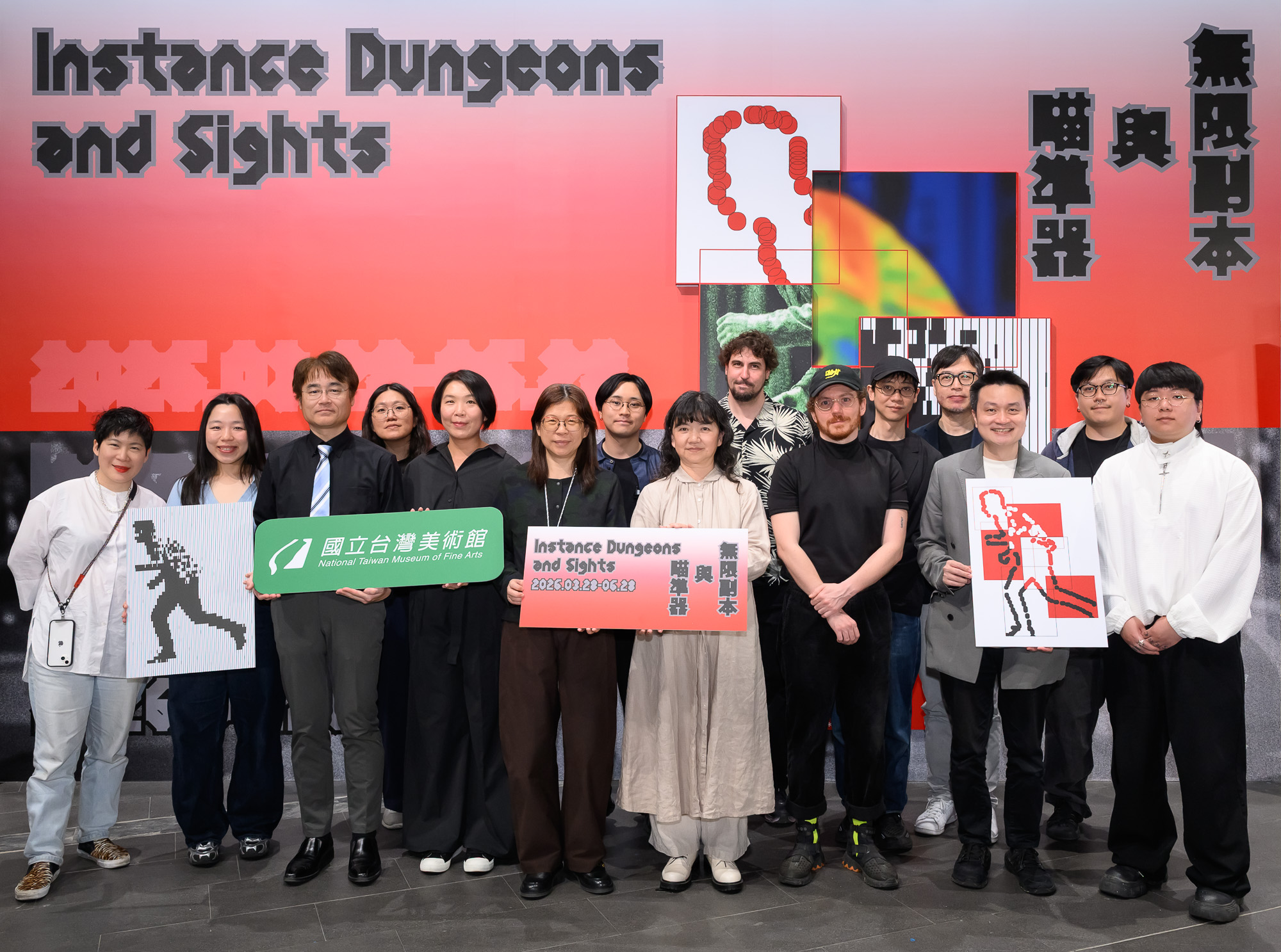 國美館「無限副本與瞄準器」開幕式貴賓合影,包含文化部政務次長李靜慧(前排右4)、國美館長陳貺怡(前排右5)、策展人陳湘汶(前排右6)、參展藝術家等人。