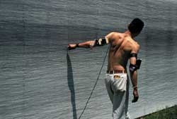 依著建築牆面,石晉華架設一面三十二乘八英尺大小的白色木板,分別以膠帶將削鉛筆機與錄音機固定在自己的左右手臂上,並將錄音機的麥克風貼在嘴上。然後開始以鉛筆來回在牆上畫出鉛筆線,同時冥思默唸《心經》和《華嚴經》。這樣走線與默誦的行動不斷重複進行,每次持續兩小時十五分鐘,全程並有錄影機紀錄下來。