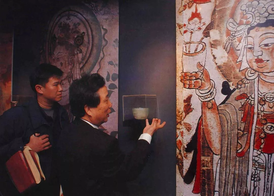 「琉璃在中西文化交通上,一直扮演著重要的見證者,」三月中在歷史博物館展出的《玲瓏晶燦──中華古今玻璃藝術展》上,館長黃光男指著敦煌壁畫菩薩手中這樣的琉璃盅表示。