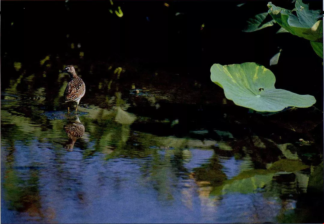在賞鳥人眼中,荷田還為鶇科、鷸科鳥類保留了生活空間(郭智勇攝)。(右)荷花花葉、梗莖,生機無限,也成喜愛的題材。清朝隱於釋道、玩世遁世的八大山人,畫有多幅「荷花水禽」,花葉墨汁淋漓,鳥兒白眼朝天,是孤傲中有無奈,簡單中有繁華。(張良綱)