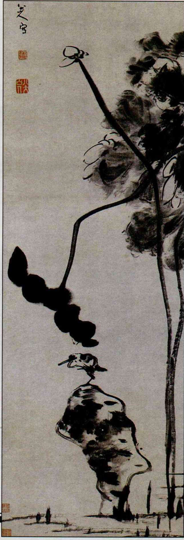 在賞鳥人眼中,荷田還為鶇科、鷸科鳥類保留了生活空間(郭智勇攝)。(右)荷花花葉、梗莖,生機無限,也成為畫家喜愛的題材。清朝隱於釋道、玩世遁世的八大山人,畫有多幅「荷花水禽」,花葉墨汁淋漓,鳥兒白眼朝天,是孤傲中有無奈,簡單中有繁華。