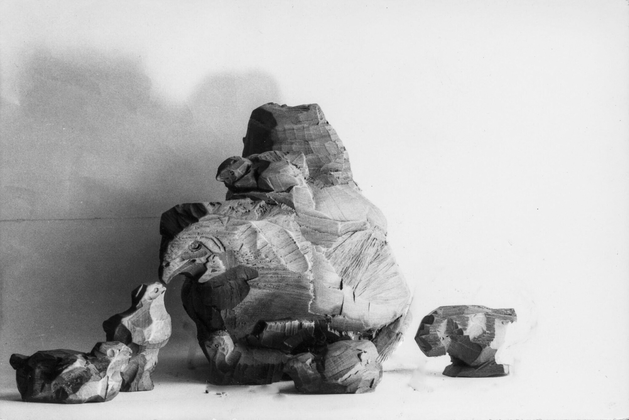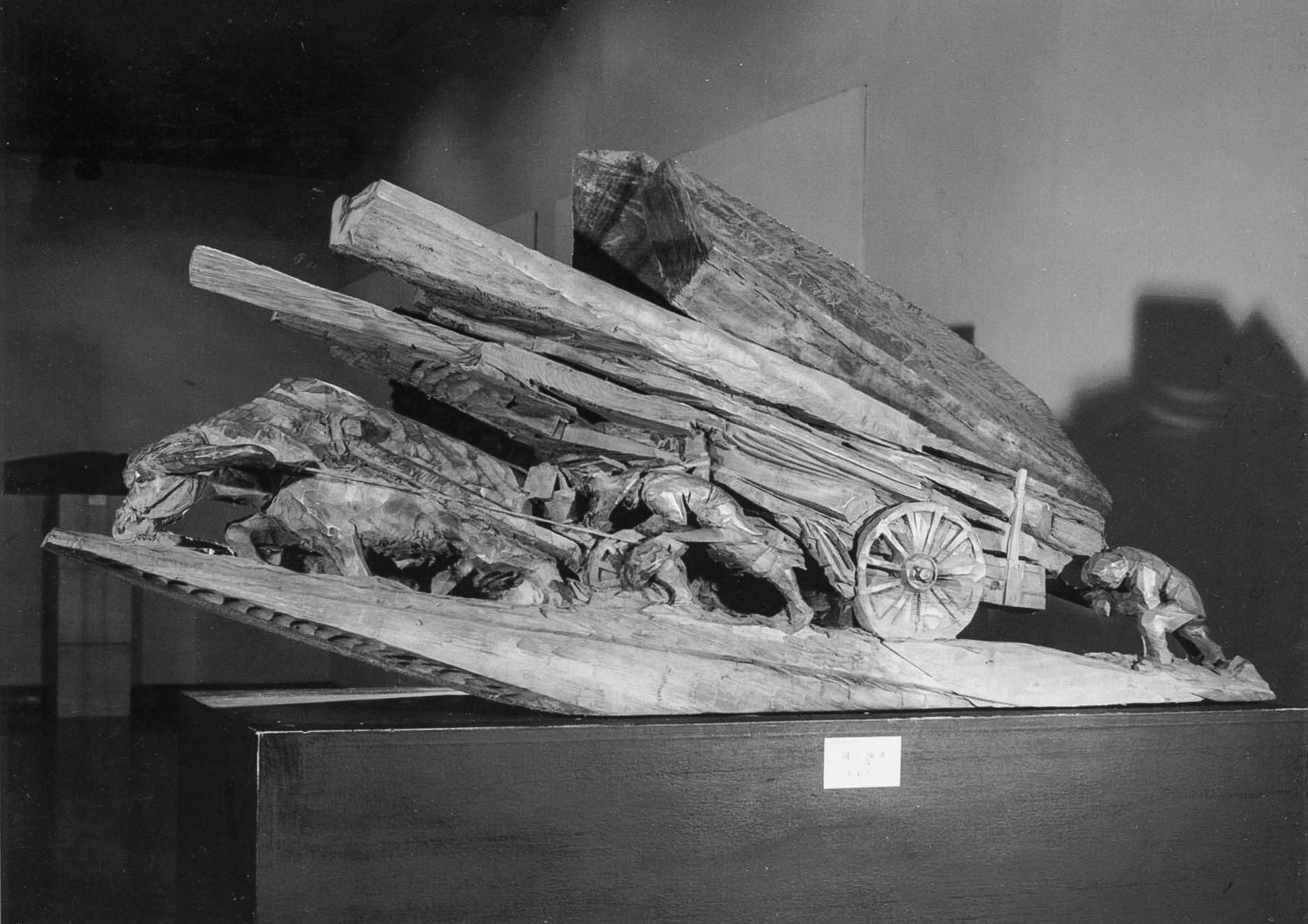 朱銘是位苦幹出頭的木雕家,從小在苗栗通霄鄉下長大,由於家境貧困,不得不幫助家堜韙,整天與牛為伍,因為戰爭空襲,他只受過兩年的小學教育;十五歲時,拜木刻師李金川學習民俗雕刻,十八歲開始自立門戶,直到三十歲參加台灣全省美展,獲得特選和優選獎,才開始在雕塑界展露頭角。民國五十七年他投入楊英風門下,由於楊英風的鼓勵與指導,這位「放牛的孩子」,終於成為一位熠熠發光的木雕健將。朱銘的木刻有兩種創作過程:一種是依著木頭的形狀即興而作,一種是先有構想再找木頭。因此,在他的那些作品中間充滿著自然與活力,也顯示出中華傳統文化中的堅忍、勤學、慈愛和純樸的美德。這也說明了朱銘能夠有今天,就是憑著這種拙樸的精神,所創造出來的。