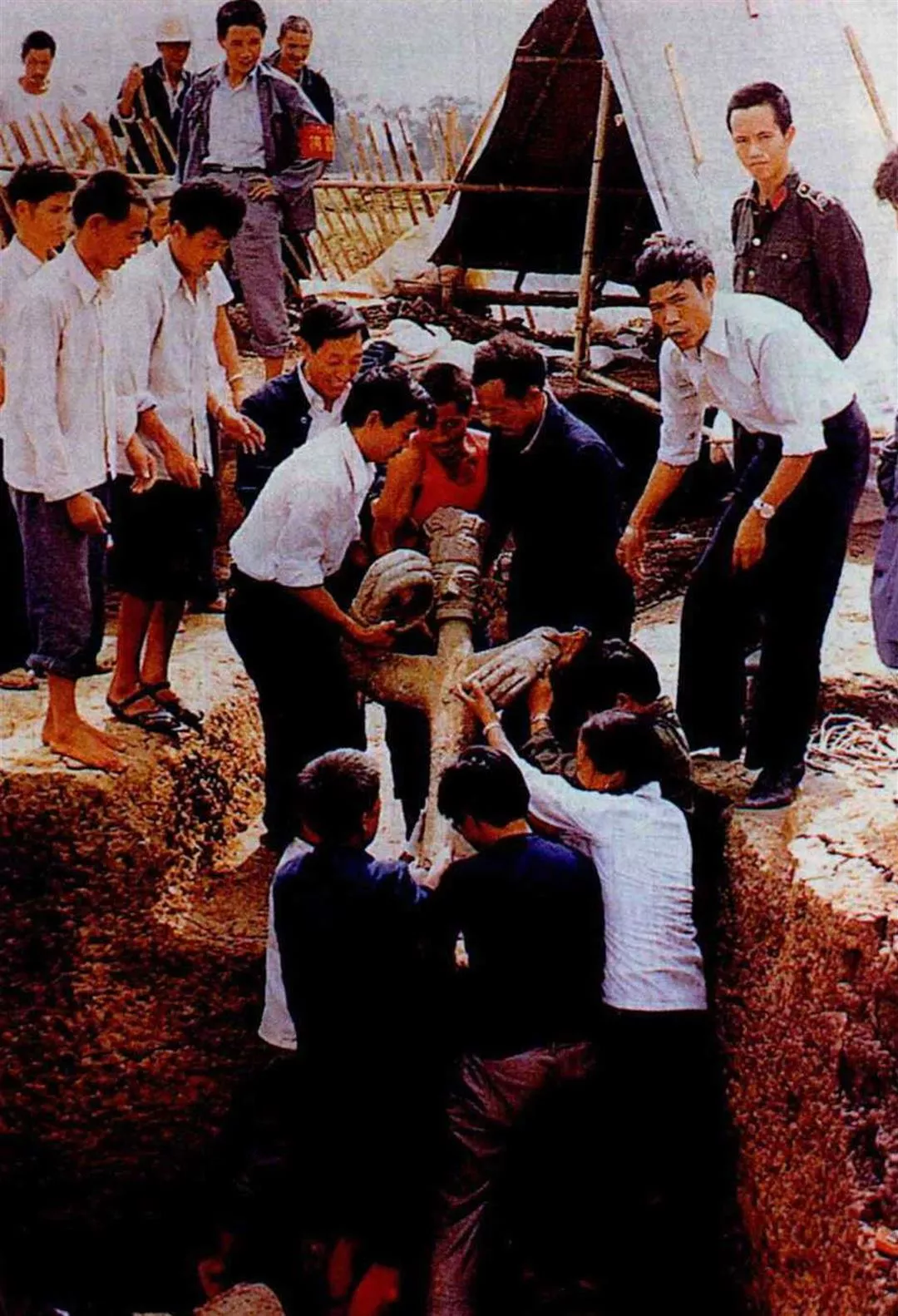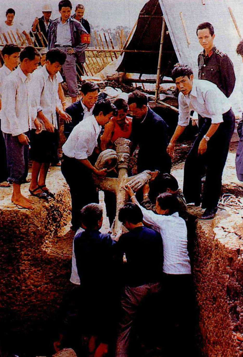 就在八六年七月決定結束三星堆工作站的時候,突然傳來了令人振奮的消息:一個磚廠工人挖到了精美的玉璋。考古人員立刻到現場進行挖掘工作,工作人員們紛紛議論著:怎麼這裡的土夯得這麼緊呢?裡面一定藏著不少寶貝。