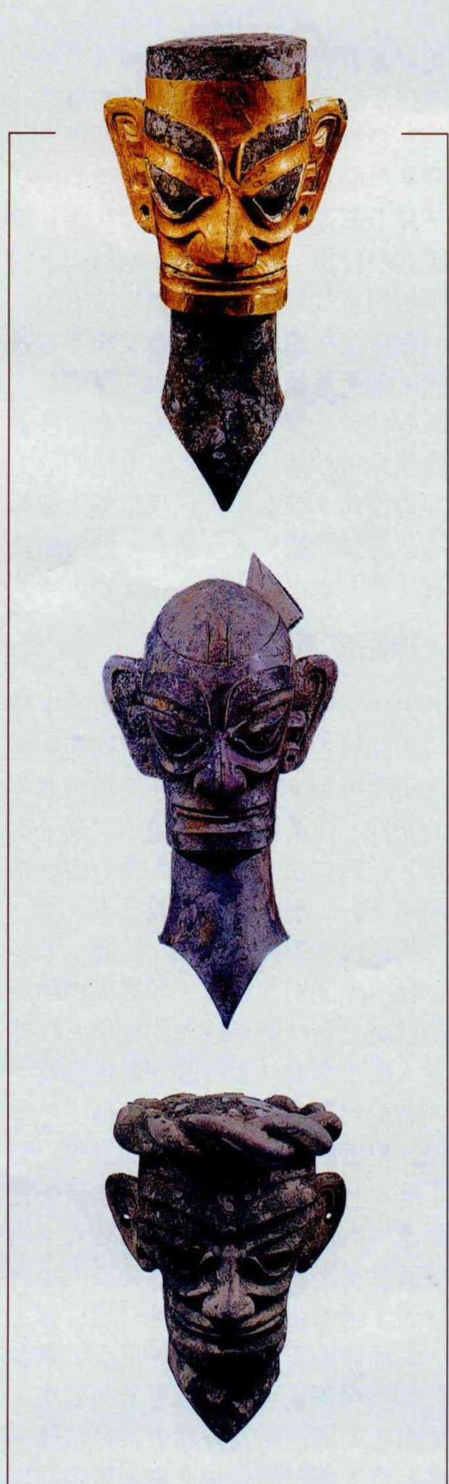 果然,除了之前常見的玉器、陶器,這個後來訂名為「一號祭祀坑」裡,商代風格的銅尊、銅盤陸續出土,接著一個從未見過的銅人頭像露出容顏;緊接著,頭戴平頂帽、兩頭尖頭盔及面罩的頭像一個個出現,還有真人等高的巨大銅人。那一張張沈睡了三千多年的陌生面容,讓在場的人訝異地說不出話來。