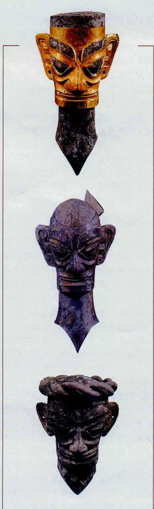 三星堆出土的頭像多達五十多個,有的戴著金面具,有的梳著蝴蝶型髮髻,有的頭上戴著辮子一樣的帽箍,有的頭髮像海浪一樣地向前捲,頂上風光各有千秋。