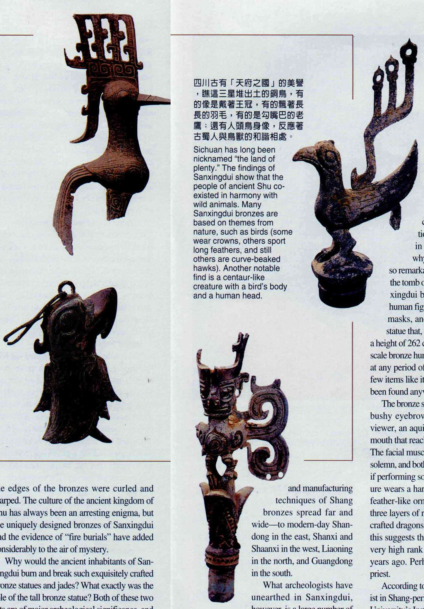 四川古有「天府之國」的美譽,瞧這三星堆出土的銅鳥,有的像是戴著王冠,有的飄著長長的羽毛,有的是勾嘴巴的老鷹;還有人頭鳥身像,反應著古蜀人與鳥獸的和諧相處。
