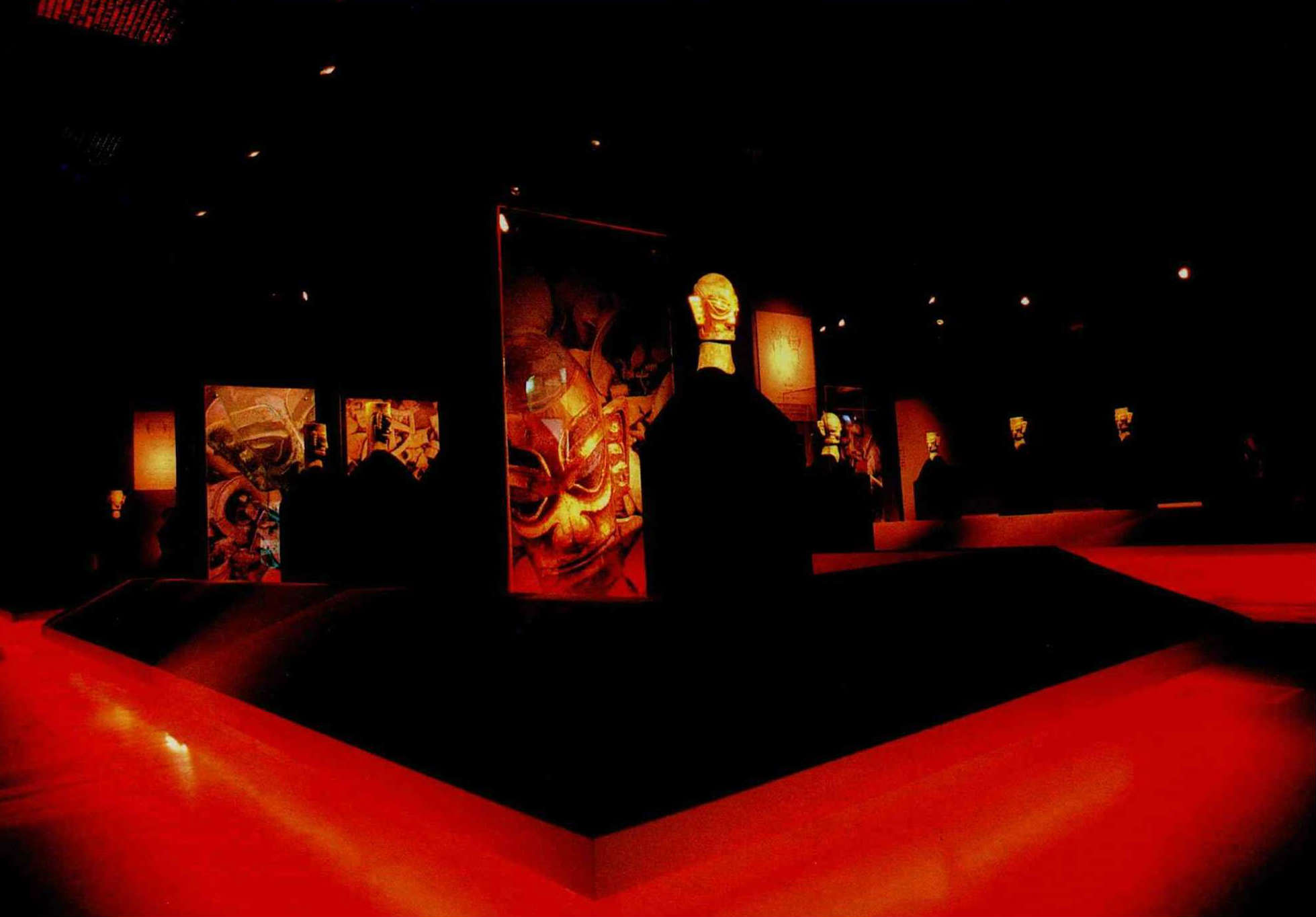 踏進故宮博物院,通過宛若時光隧道的燈箱門,首映眼中是兩公尺多的巨大銅人,王者般威嚴肅穆地俯視群眾。黝黑的空間裡,兩個發著紅光的祭祀坑內,一個個戴著面具的青銅頭像排列其中;牆面上,是一大幅沈睡千年、方才出土的現場照片,照片前,一個眼睛突出怳誘膜幫牧漸角j面具,直直與進入時光隧道的現代人互相對看……。