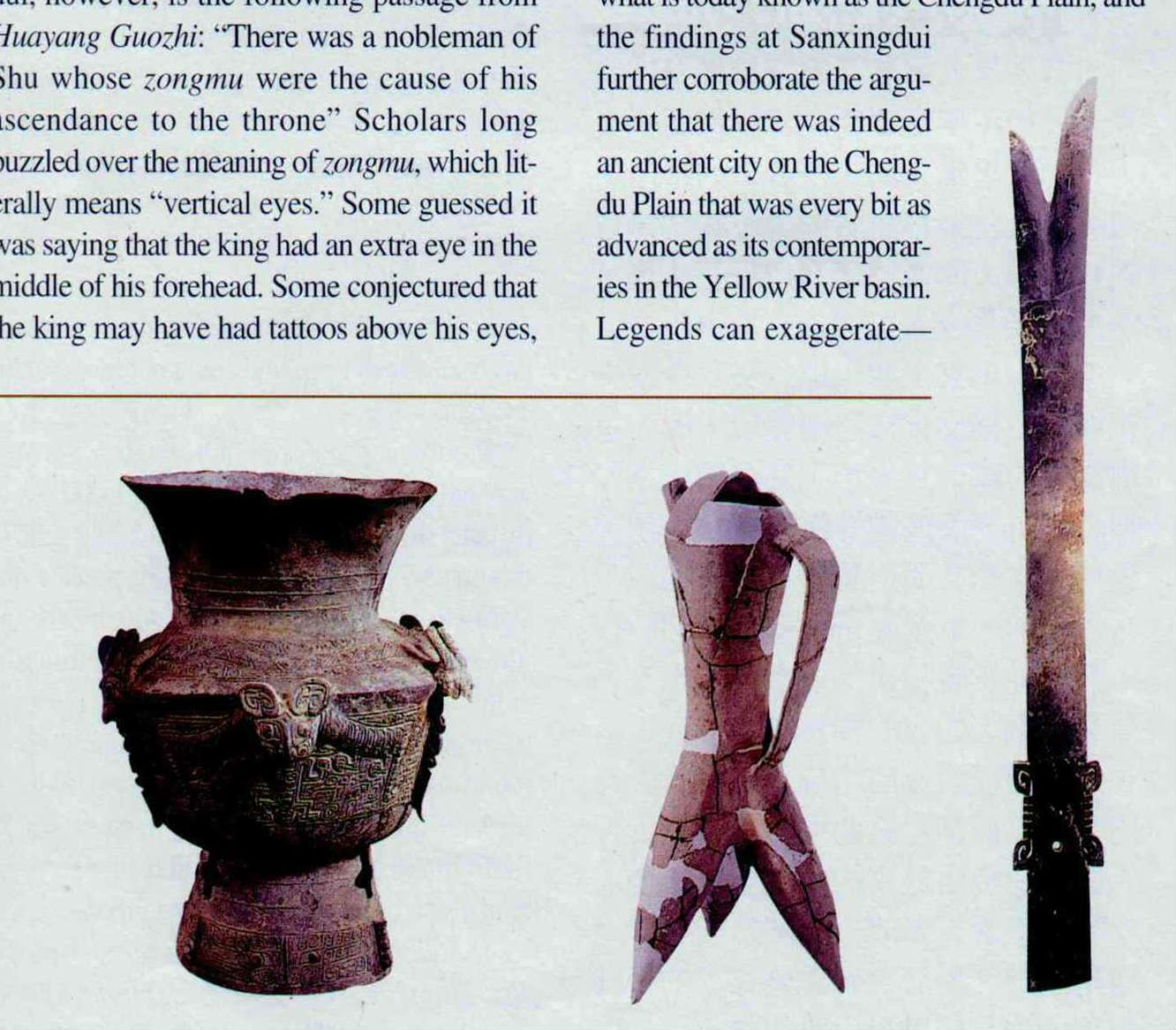 歷經數度戰火的停頓,考古學家們在五、六○年代才又回到月亮灣與三星堆,這裡一點、那裡一點地挖掘,從不斷出土的眾多遺址及琳瑯滿目的玉器、陶器,推測那裡可能是古代蜀國的一個中心都邑。