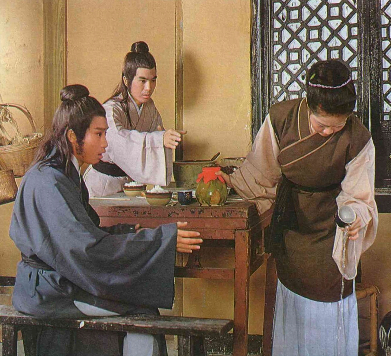 王覽知道酒中有毒,搶過酒杯便要代哥哥喝;王祥心知是怎麼回事,也趕緊去奪酒杯。因此毒酒在飯桌上被爭來奪去,情況頗為緊張。朱氏眼見兄弟倆爭喝毒酒,惟恐毒死親生兒子,只有搶過酒來,倒在地上,才息了這場紛爭。