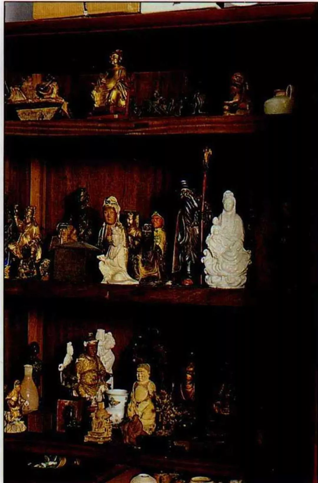 佛像、傢具、版畫、海報、香菸畫片,甚至舊衣服……,林漢章收集一切老舊的東西。(林盟山)