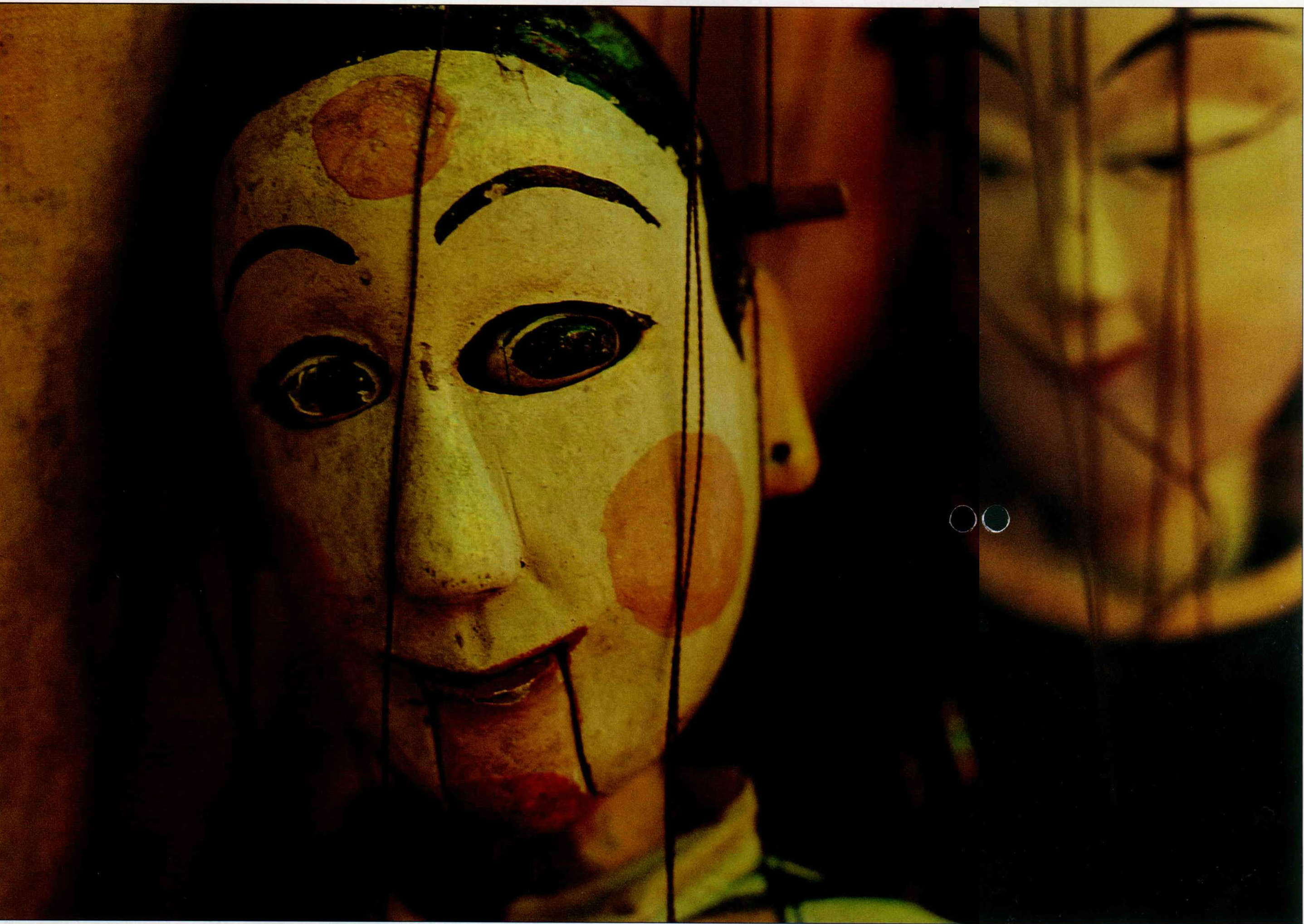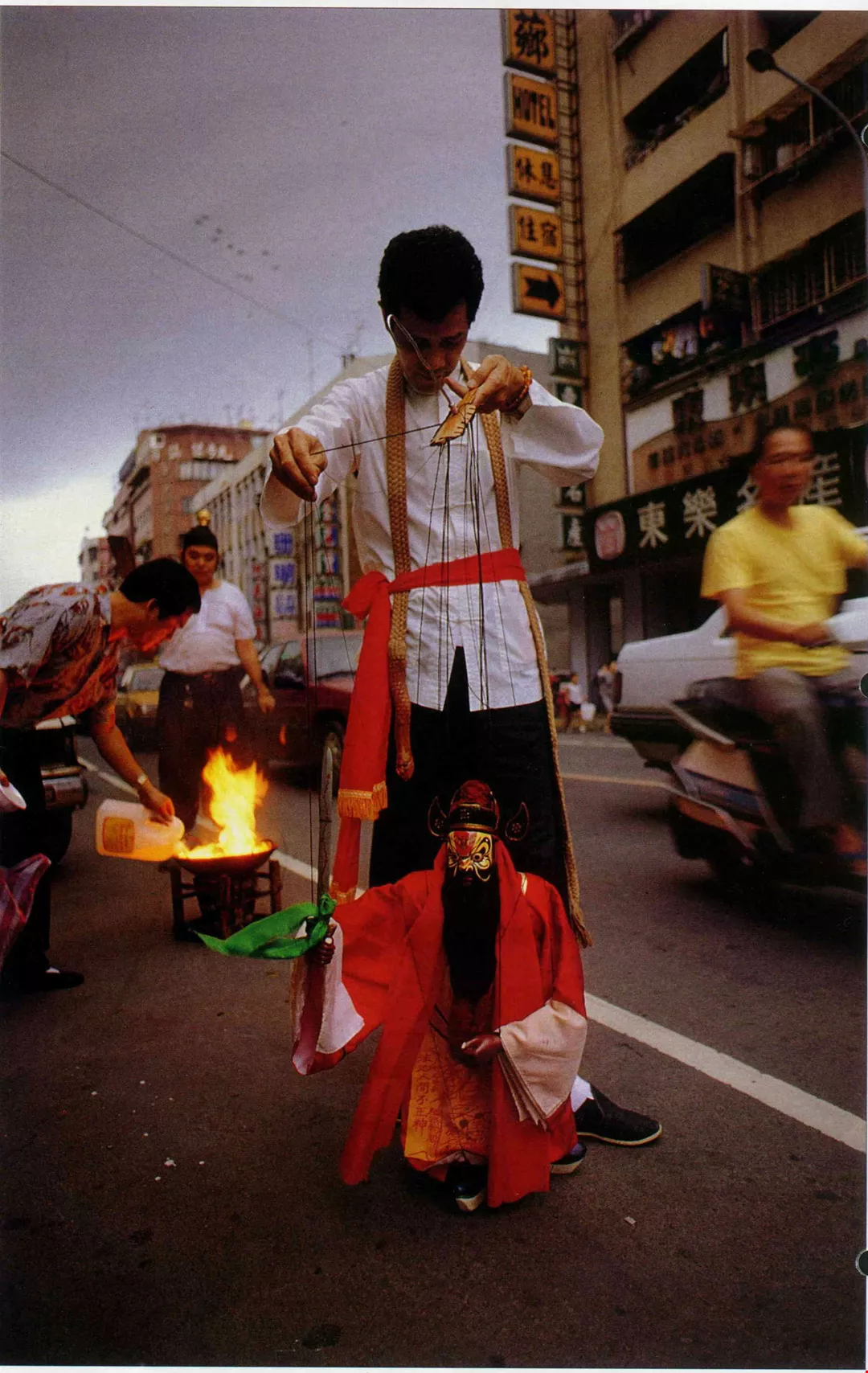 晚上六點剛過,台北一家百貨公司櫥窗前,國家民族藝術薪傳獎得主林讚成在臨時搭設的舞台上,為一個個即將登場的傀儡戲偶繫上桃紅、翠綠的頭巾,戴妥頭盔、珠花,再披上坎肩。妝扮妥當的傀儡,鳳眼微睜地掛在架上;稍一起風,就沒筋沒骨地微微搖動,映著五色燈光,漾出一股虛幻詭譎的氣氛。