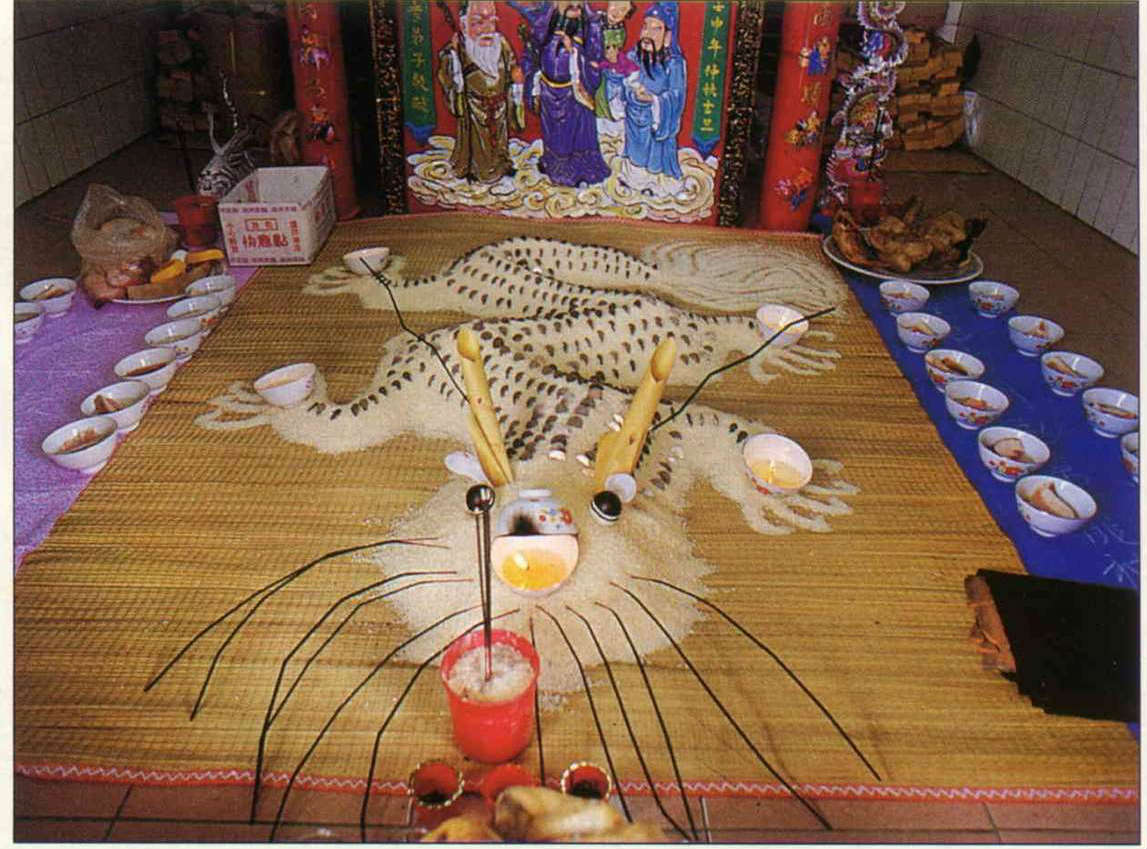 新廟落成「開廟門」,道士以米為龍、以錢為鱗,燃香祭拜叫「安龍」。