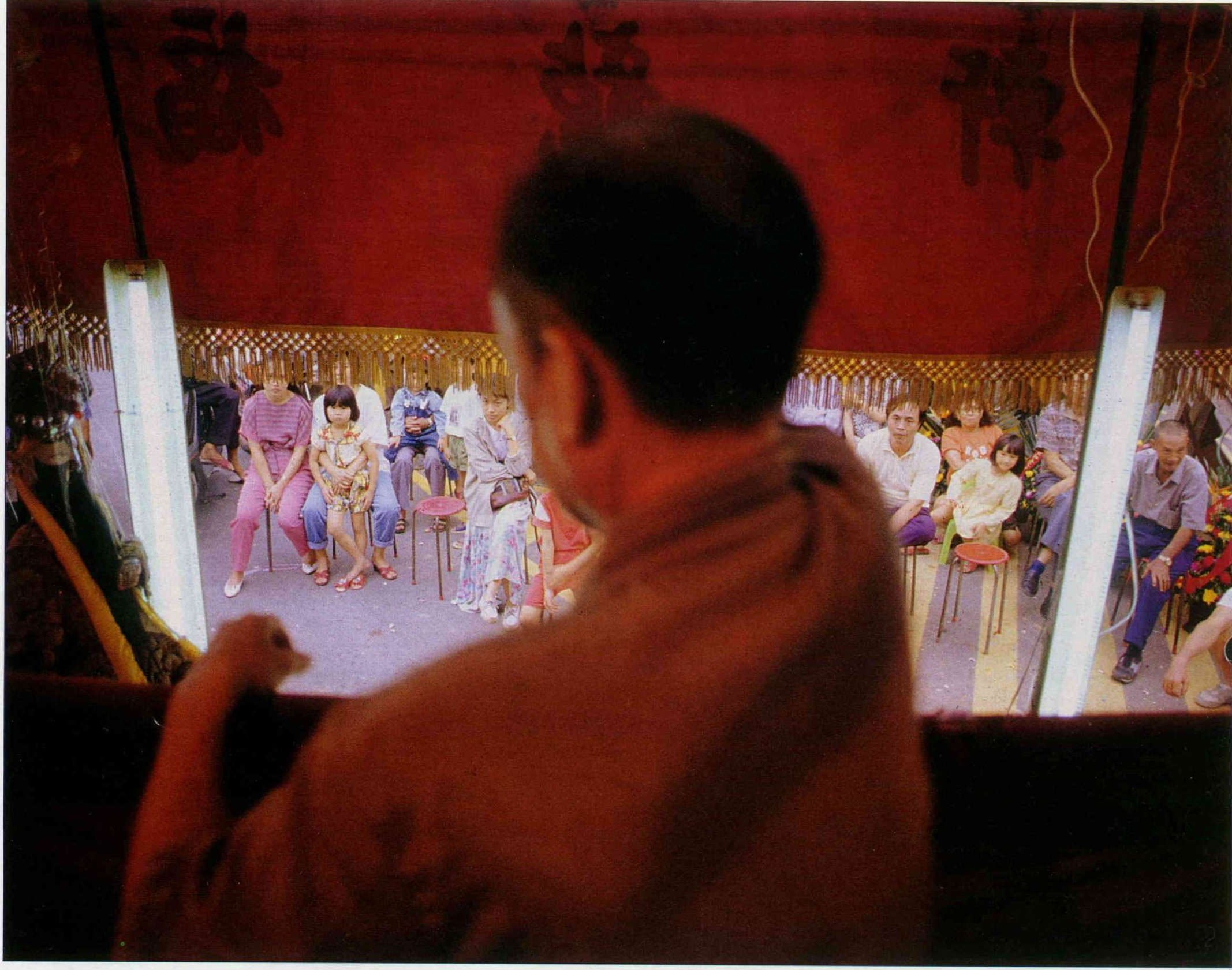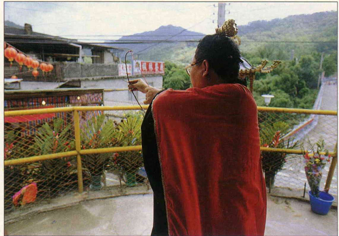 尖厲的嗩吶鑼鼓響起,許文漢屏氣凝神,用力一跺腳,猛地將一把七星短劍插入戲台前。剎時,氣氛由普渡時的熱鬧喧騰轉為緊張肅穆,這和都市地區人們好奇圍觀的熱鬧氣氛截然不同。