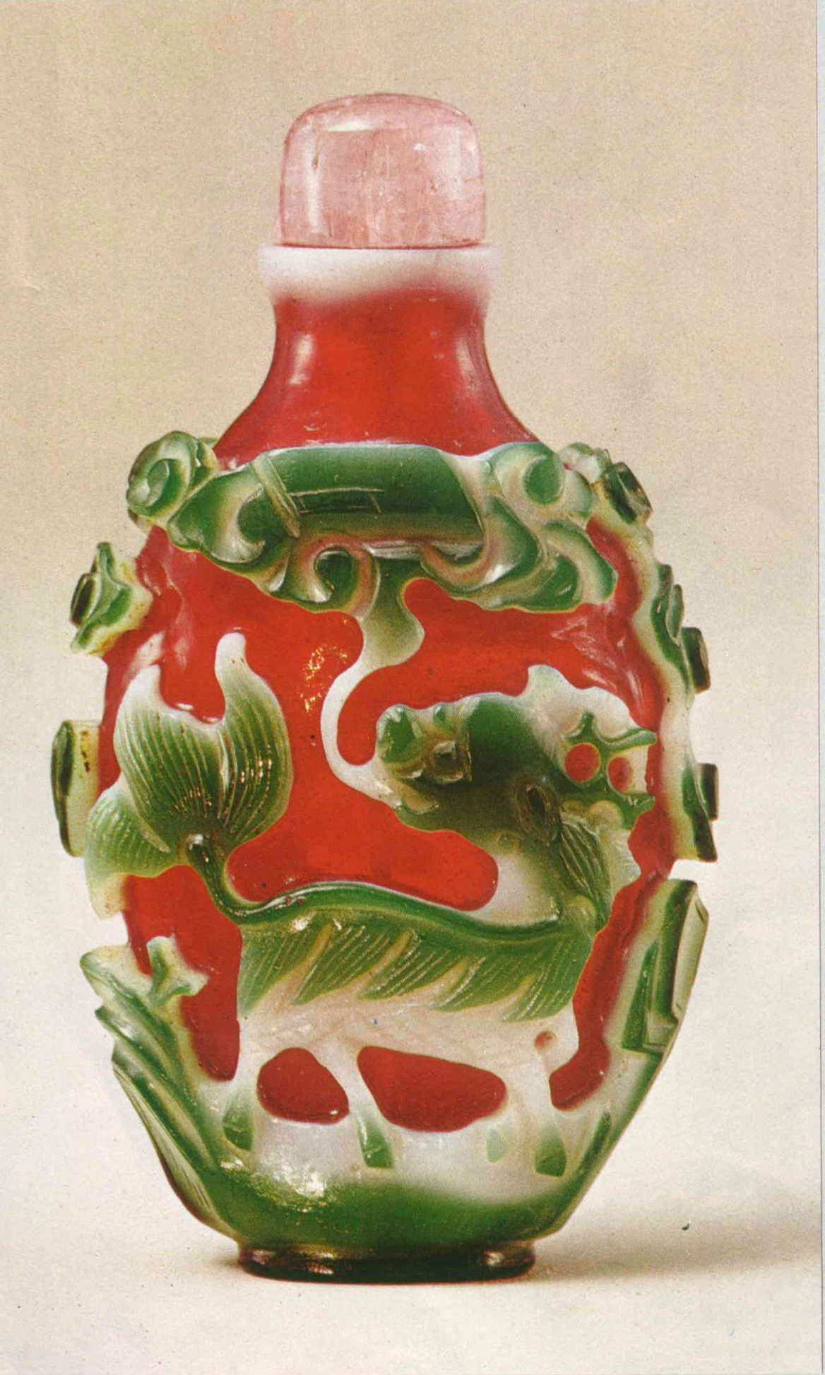 左圖是一只五彩套料麒麟吐書鼻煙壺,壺呈扁圓形,高五.六公分,寬三.八公分,厚二.一公分,通體透明紫紅色,套上綠、白二色,一面雕麒麟吐書,襯以山石;一面雕鯉魚噓璧,襯以波濤。