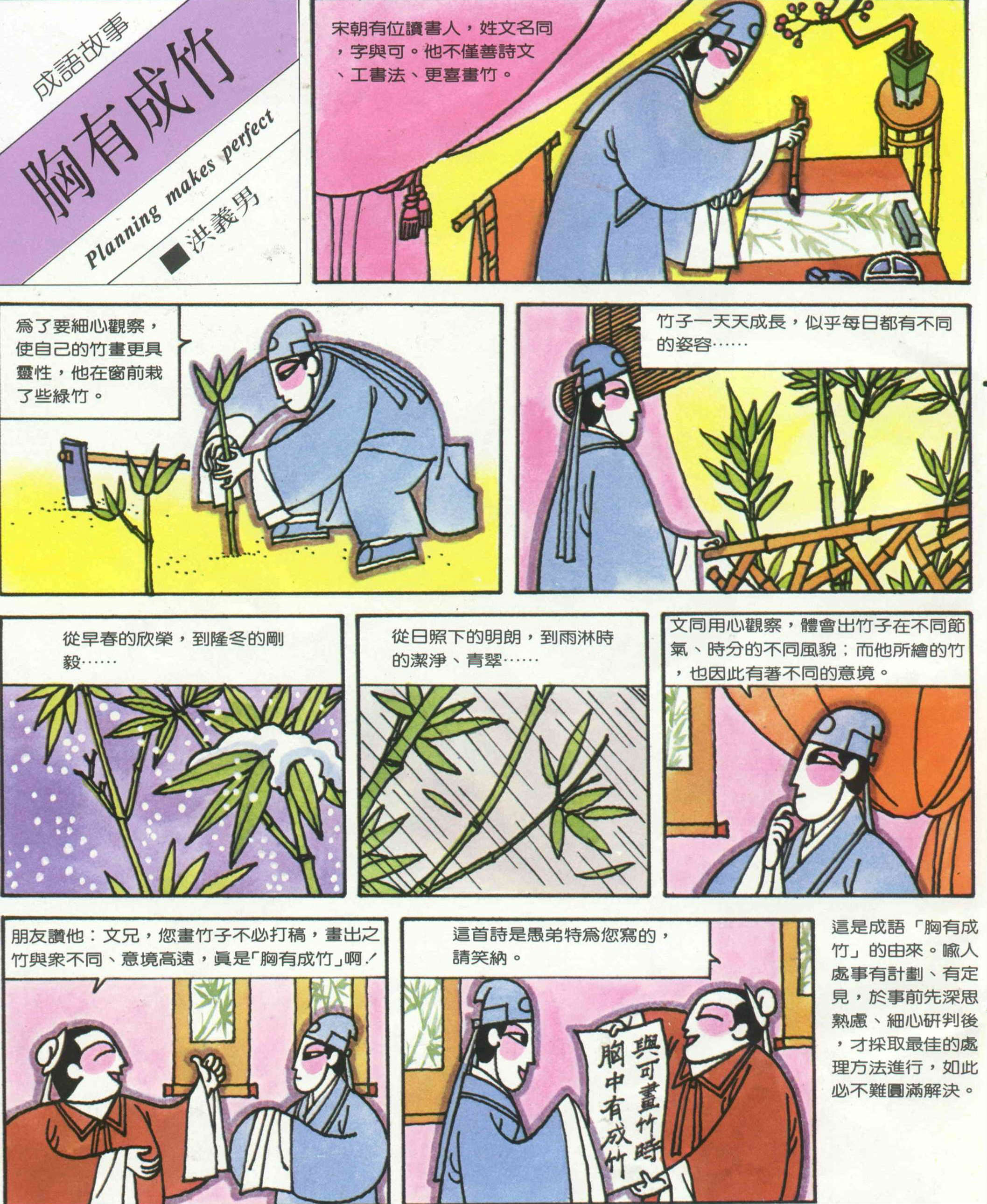 這是成語「胸有成竹」的由來。喻人處事有計畫、有定見,於事前先深思熟慮、細心研判後,才採取最佳的處理方法進行,如此必不難圓滿解決。
