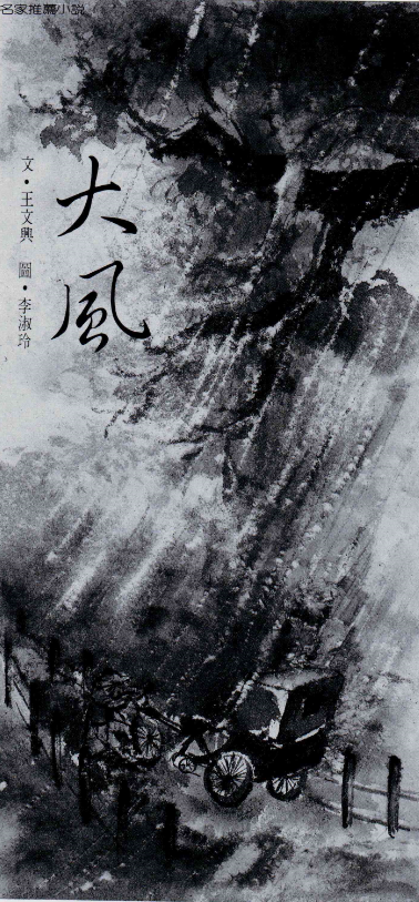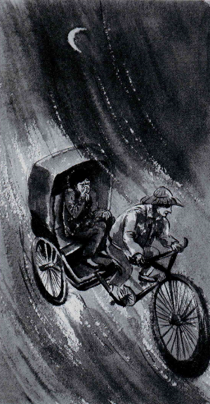 奇怪,這一響,風好像停了。不是好兆頭,更大的颱風,更呼烈的颱風,就在眼前。這刻該有十二點了罷?咦!怎麼?這樣快!開始了嗎?來了,來了,全部的主力都開上來了!雨也來了!這一陣雨好強勁,沖得跟瀑布一樣。先生,讓我拿一拿雨衣。雨好像為我洗臉,暖和和的雨,跟紹興酒一樣。前面就是大橋了。呵,這條河,漲水啦!不是河,是一片海!橋上連個鬼影也沒有。橋上的風一定更大。聽那急湍聲音,像是打雷。媽的,衝了!……我透不過氣……橋好像在搖,這水泥橋挺堅固,大概不致……去年有一次颱風,一輛三輪,在這橋上,被刮下河,……說不能過,也過掉一半……過了一半,我就跟已經到了對岸似的快活,一半都已經過完,剩下的一半自無問題……前一半,包括了後一半……我們過來了,先生!