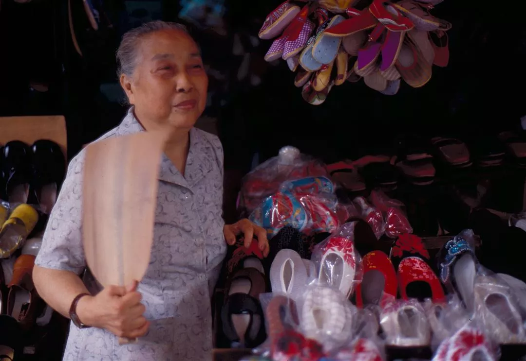 圖1:賣鞋的老太太,手持大王椰扇扇涼。(張良綱)