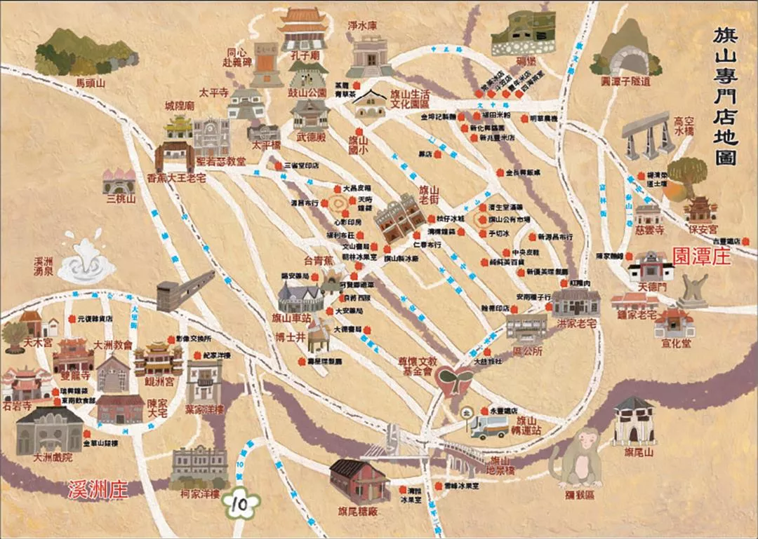 小鎮的地圖記錄旗山的文史地景、產業老店,台青蕉常舉辦社區小旅行,帶領大家認識不一樣的旗山小鎮。(台青蕉樂團提供,蔡政諭繪)