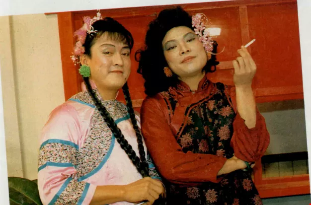 伶牙俐齒的張菲(右)演董娘,粗枝大葉的檢場扮村姑,男扮女裝是黃金拍的拿手戲。(張潭禮攝)