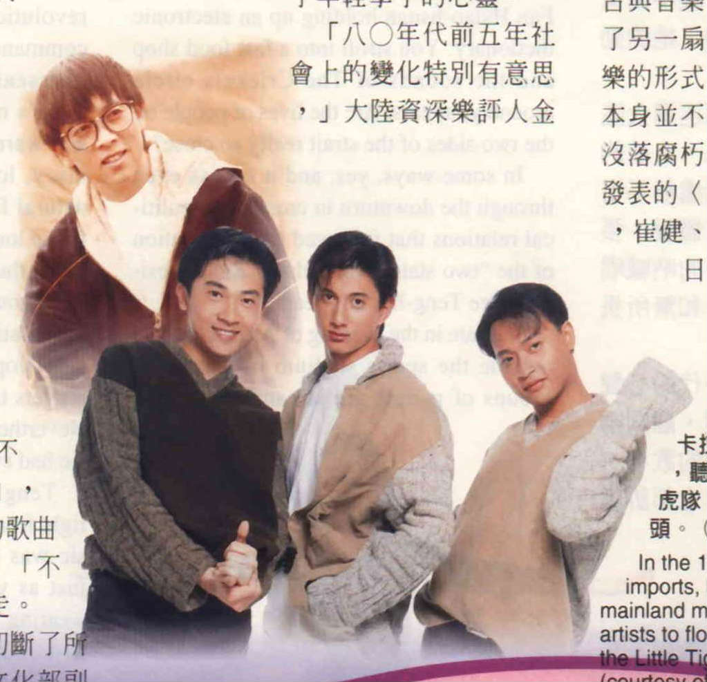 有趣的是,在主流價值對「流行音樂」還很有爭議的八○年代初,台灣校園歌曲的進入,卻向一批從小學習古典音樂、民族音樂的愛樂青年開啟了另一扇窗,「人們終於明白流行音樂的形式不過是一個載體,這一形式本身並不等同於『靡靡之音』或是『沒落腐朽』,」金兆鈞在一九九六年發表的〈歌壇十年故事〉一文中指出,崔健、王彥軍、吳海崗、李海鷹等日後執大陸流行音樂界牛耳的人物,「從當時的港台歌曲中,特別是校園歌曲中意識到:流行音樂是一個廣闊的天地,在這裡他們可以大有作為。」