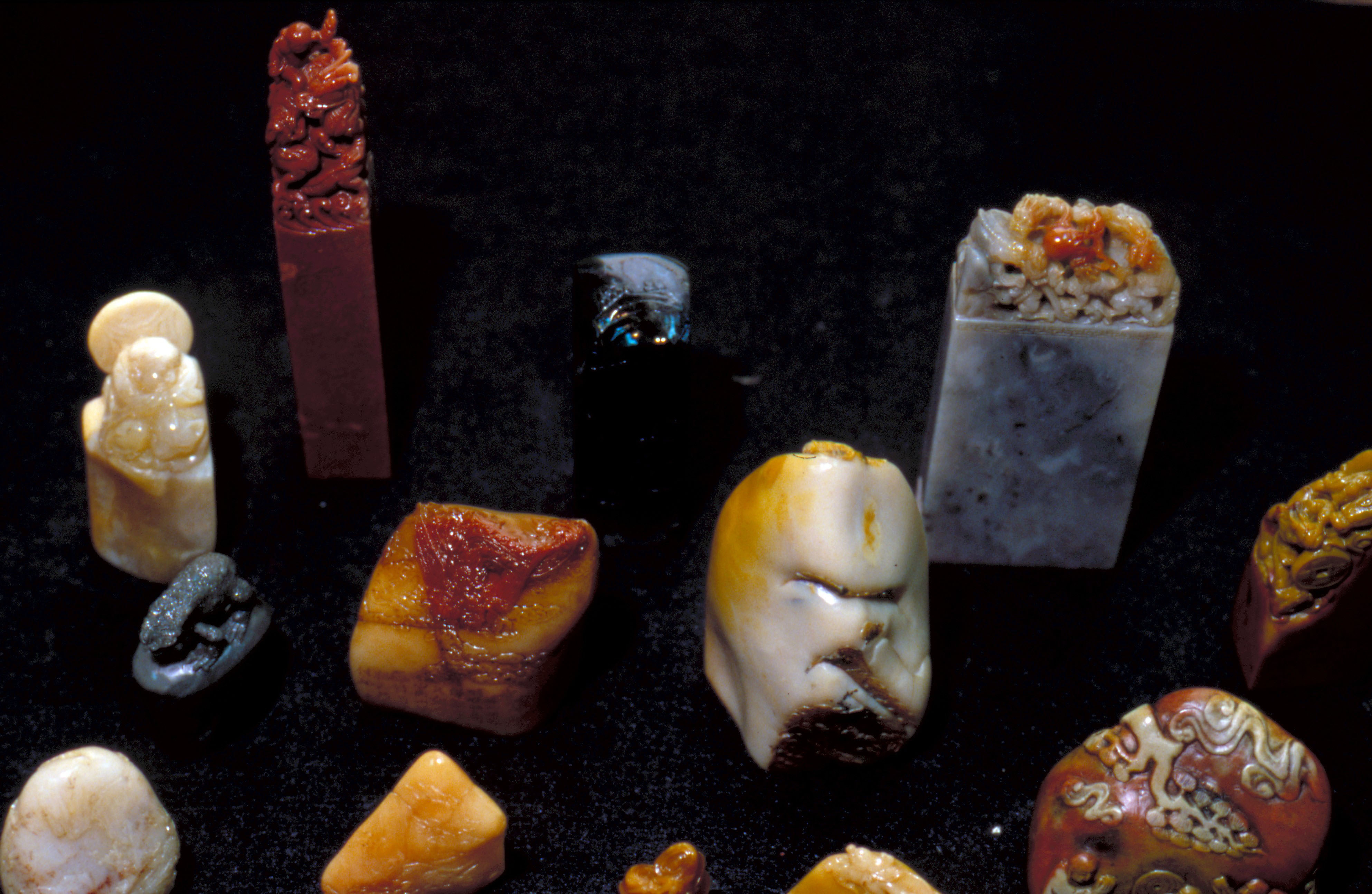 現在市面上隨處可見的泰來石(泰國清邁出產)和青玉紋石,形狀各具巧趣,色澤也頗溫潤,而且價格低廉,一方普遍的印石不過新台幣五十元左右,算是現代最「大眾化」的藏書印石了。