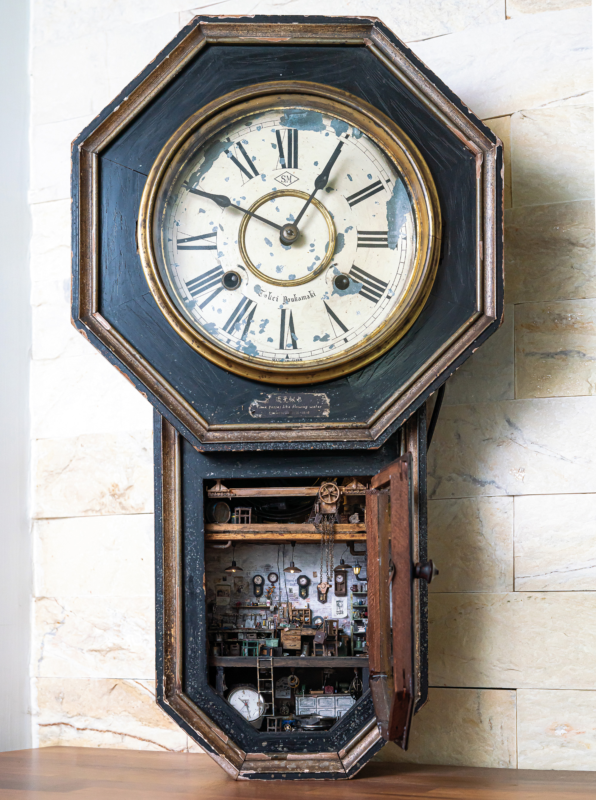 「我是個很念舊的人,媽媽買給我的第一個鬧鐘,到現在都還好好收著,想著哪一天可以將它的零件放進我的作品裡。」他將母親曾經戴的舊錶,放進新作鐘錶修理店《時光似水》(比例1/35)中。那是一座很大的西洋古鐘,是一位知道鄭鴻展喜愛舊時代感物件的日本友人,特地從日本古董鐘錶店淘到,寄到台灣作為慶賀他新婚的禮物。