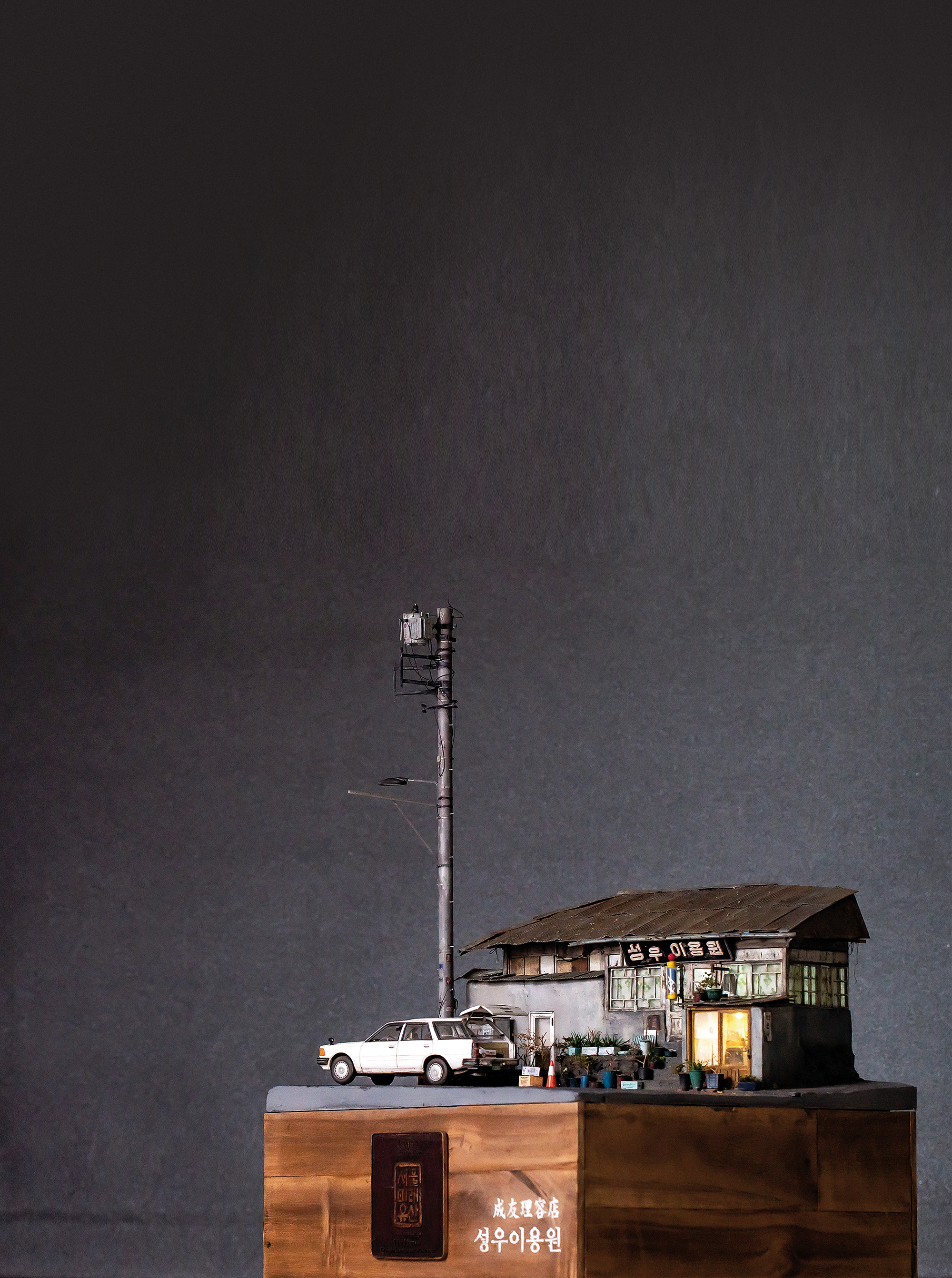 鄭鴻展的細節控到什麼地步呢?為了完成作品《韓國成友理容院》(比例1/35),他Google出這間近百年的理容院現實中各角度的老照片,完美複製電線桿上那些韓文傳單和告示、木質牆壁與窗框的剝落,以及屋頂鐵皮歷經風雨的鏽蝕感。