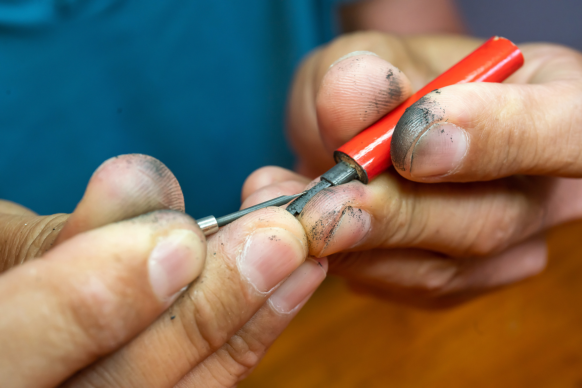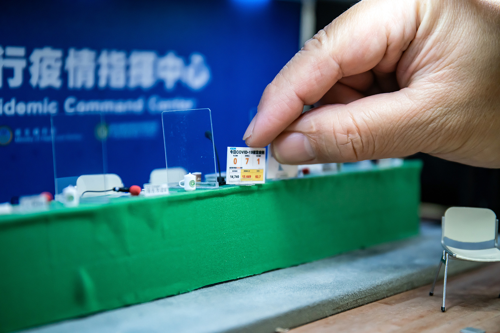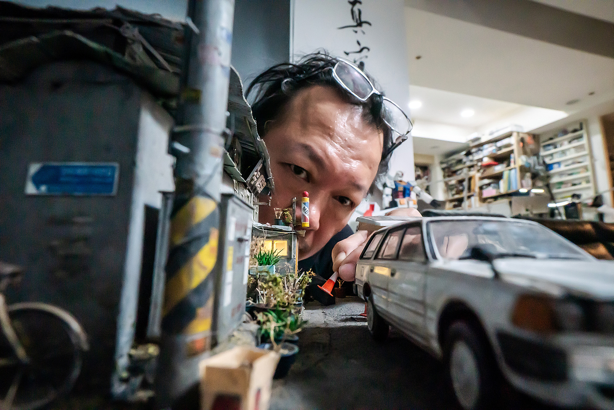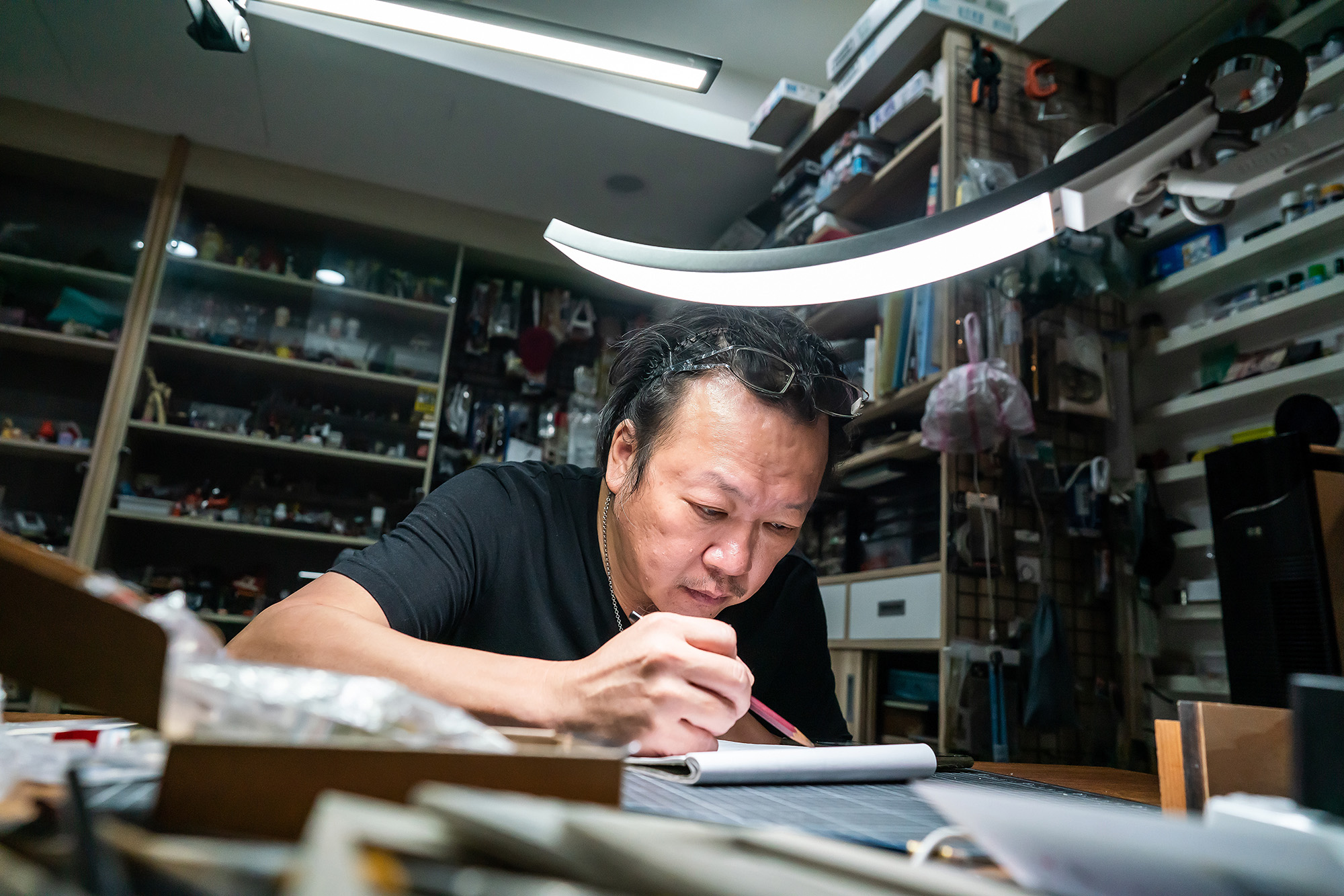 同樣以裸眼進行創作的鄭鴻展,每件作品都像是把場景物件照了哆啦A夢的縮小燈一樣,除了視覺仿真度外,還追求精準比例。捲尺和游標卡尺幾乎成了他的隨身標配。「身邊要是暫時沒有工具可以量的話,我會用手掌、手臂、指甲和身高來當比例尺。」把自己變為「人體測量工具」的鄭鴻展,對比例與細節質感有著極高的堅持。