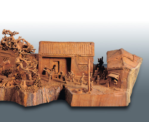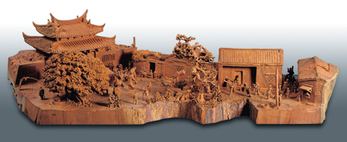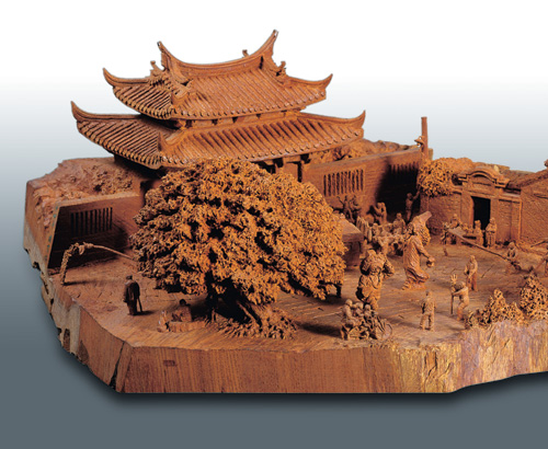 黃國書覓得一塊108公分長的珍貴台灣櫸木,依樹幹天然的曲折造型,細膩雕鑿出鹿港的百年古厝、龍山寺山門,以及蜿蜒小巷內的斑駁的壓艙石路,並且將肅穆的遊行陣仗和爭睹膜拜的民眾巧妙綴入。為了表現龍山寺百年古剎的優美建築、歷盡歲月剝蝕的木頭、磚頭上風化的痕跡,他還特地爬上制高點拍攝鳥瞰圖。