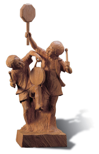 一系列充滿童趣記憶的作品,活潑逗趣,「小時候印象最深刻的就是『暗訪』和『廟會』;活動前進行職務配置時,每個小孩都搶著掌旗,最後以抽籤方式決定,抽中掌旗的人當然既興奮又得意,所以《開路先鋒》一作中,掌旗者滿臉得意;繼掌旗之後大家爭相擔任的就是敲鑼打鼓的角色,有一回和哥哥雙雙抽中,雀躍的心情至今仍印象深刻,藉由《歡天喜地》一作,重現兄弟倆協力同心、敲鑼打鼓時的歡喜神情。」