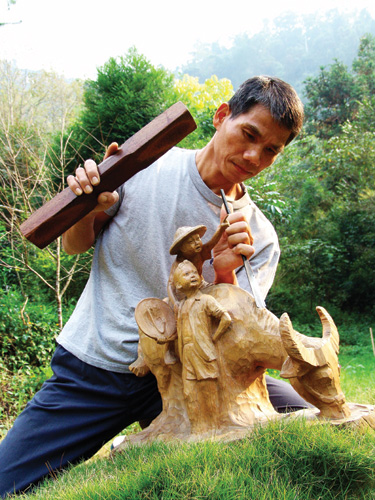 面對塵封斑鏽的工具,雖睽違數年卻恍如昨日,依然熟悉,「在科技化社會中選擇冷門的木雕作為終身職業,是因緣也是適性,更是深思熟慮後所作的抉擇,」黃國書知道,這不僅是故鄉的召喚,更是瞭解自性後的回歸。因此,雖然年逾三十重操舊業,卻是帶著歡喜的心情再度當學徒。