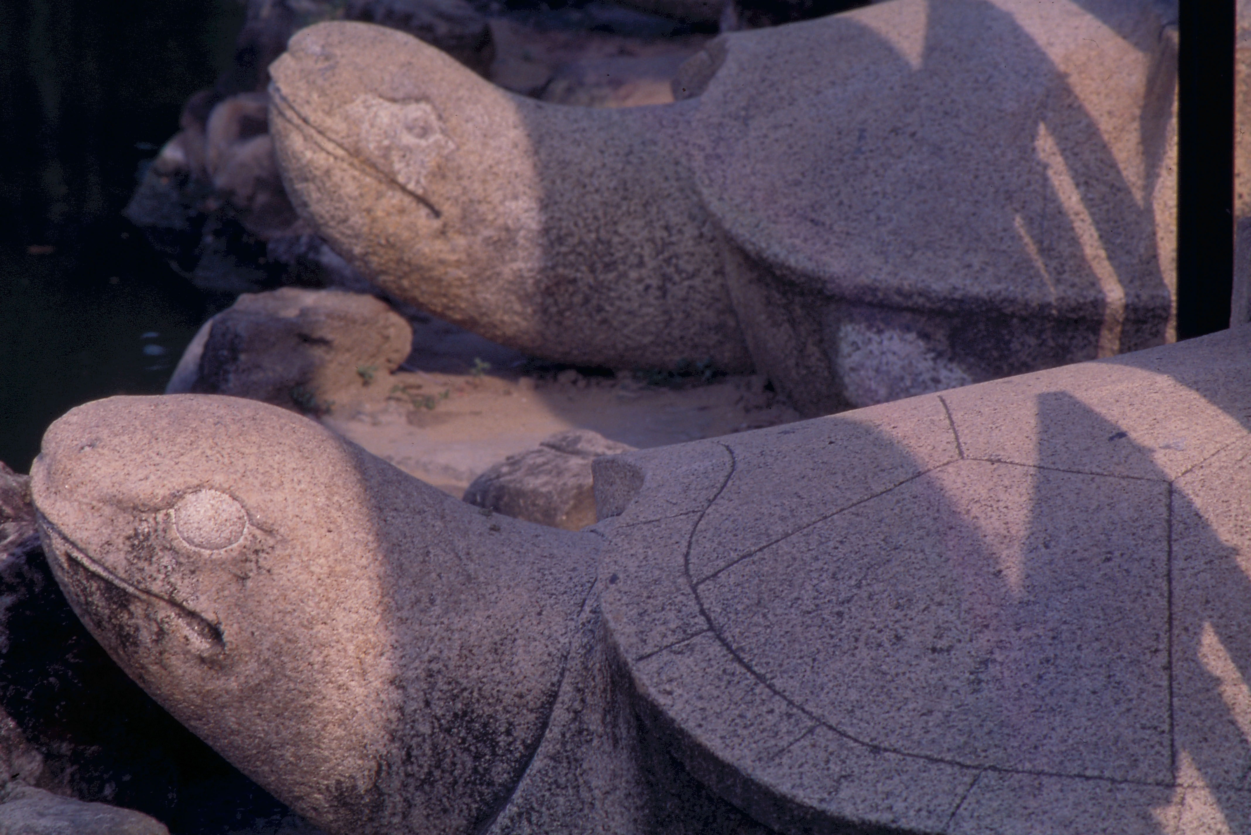 神龜負重,從古代文獻可以找到不少資料;首先是在神話傳說裡,龜常被當做天地的象徵,「禮統」就說神龜的形象,上圓法天,下方法地。「淮南子」說女媧煉五色之石補蒼天時,更取大龜的四足立四極——所謂四極,就是立於大地四隅用以支天的柱子。