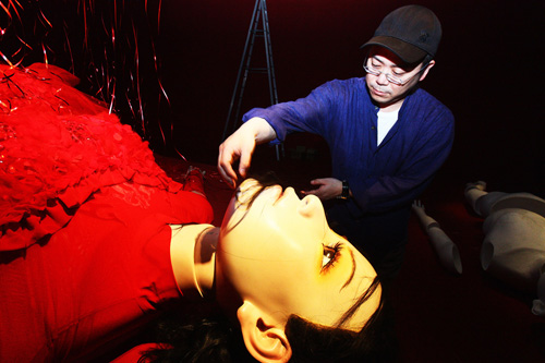 驟雨後的初夏午後,葉錦添一襲麻紗上衣、裝扮輕簡地出現在台北當代藝術館,他個頭不高,不到一米六,戴著一頂像是從未脫下的黑色便帽。此次來台不為別人作嫁,為的是他自己在台灣首度舉行的大型個展《仲夏狂歡》。時值開展前日,他在偌大的展場中四處巡察,從燈光角度明暗、展場動線等,一一提點工作團隊,光是展覽主角──人偶「莉莉」的髮絲線條,就前後撥弄了十來次,他用濃厚的廣東國語笑道:「我很『難搞』的。」