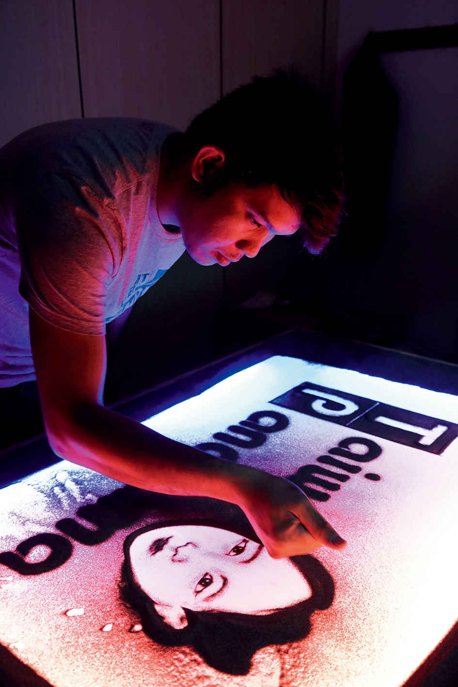 「我看過別人表演沙畫,覺得很神奇。」一盤散沙在藝術家手中,瞬息萬變,像是魔術般出神入化。就是這道靈光,開啟了馬力歐璀璨的人生。「我是看YouTube的影片學的。」從未接觸過沙畫,經濟條件也不允許他花錢學習,只能暗自摸索,無師自通。