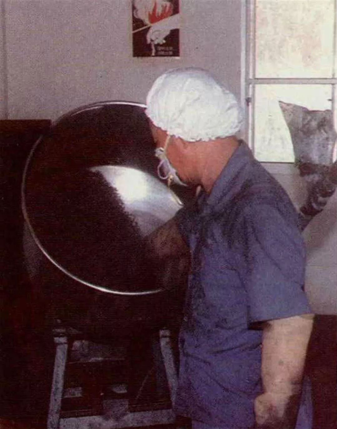 飛揚的塵灰,沾染滿頭、滿臉、全身;機器在轉,雙手還須攪拌,使藥球滾得均勻,煙火師傅的衣裳可全讓汗水浸濕了。(聯勤總部提供)(聯勤總部提供)