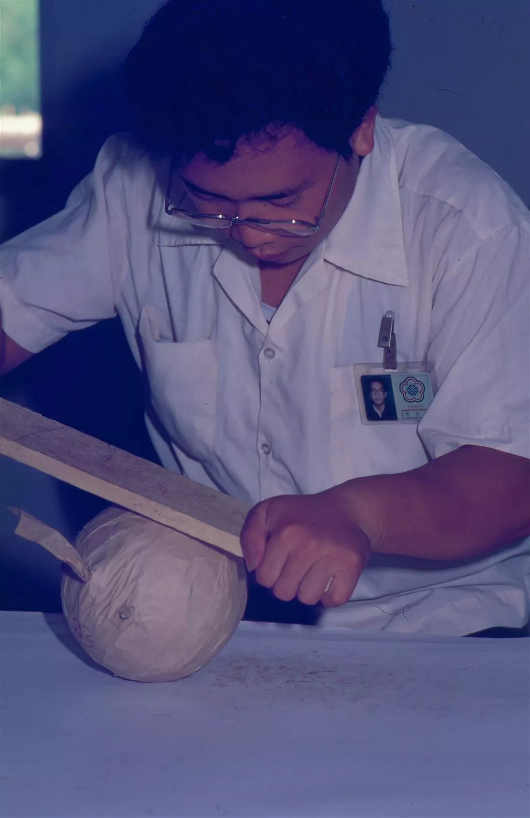 用牛皮紙糊好彈後,還須拿塊板子把紙壓平,這是「壓彈」,可不是「鴨蛋」噢!(陳敏明)
