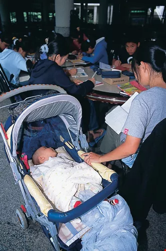 大餐廳中找個角落就上起自編教材的「華文」課了!老師一邊上課一邊搖著小baby,似乎一點也不礙事。