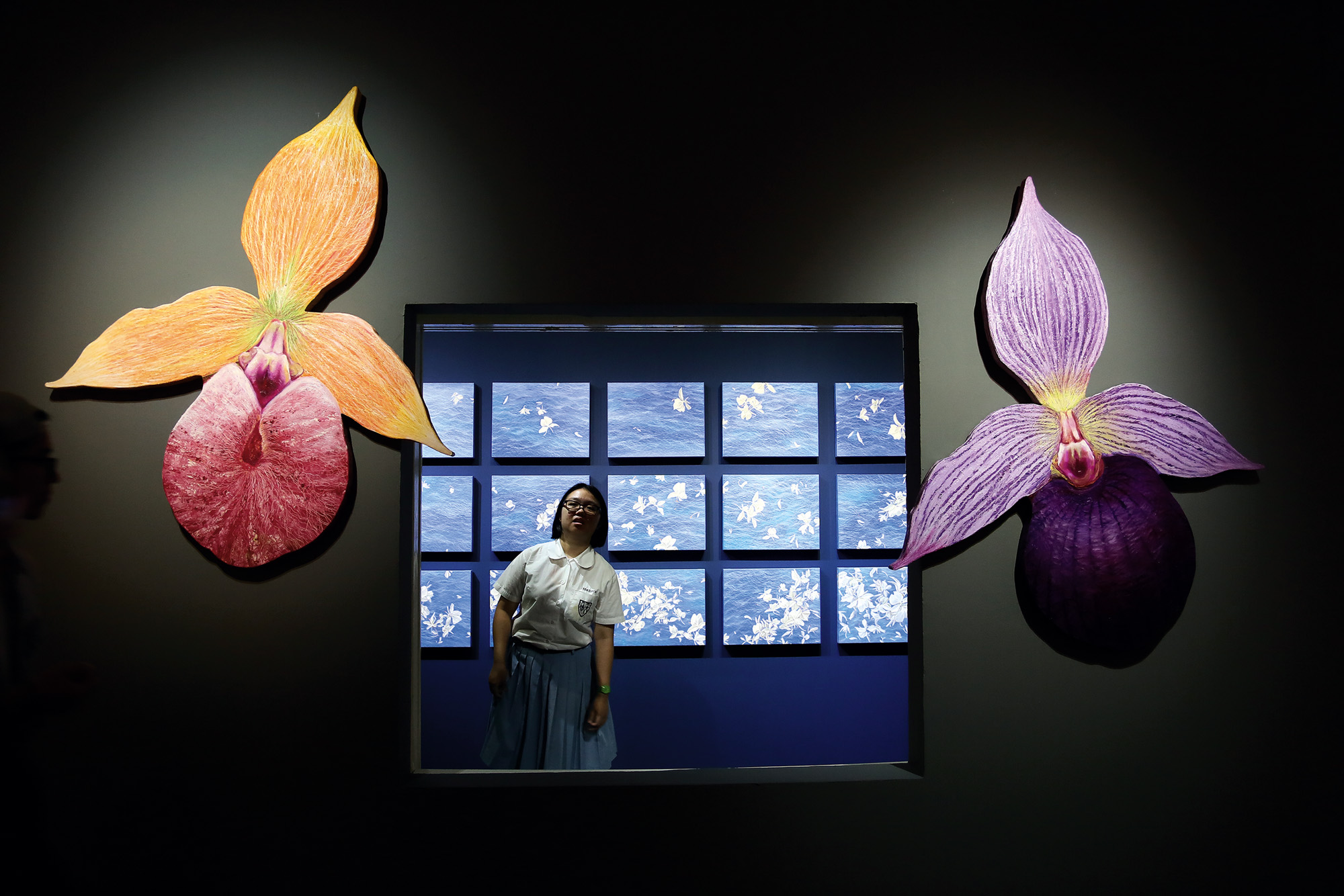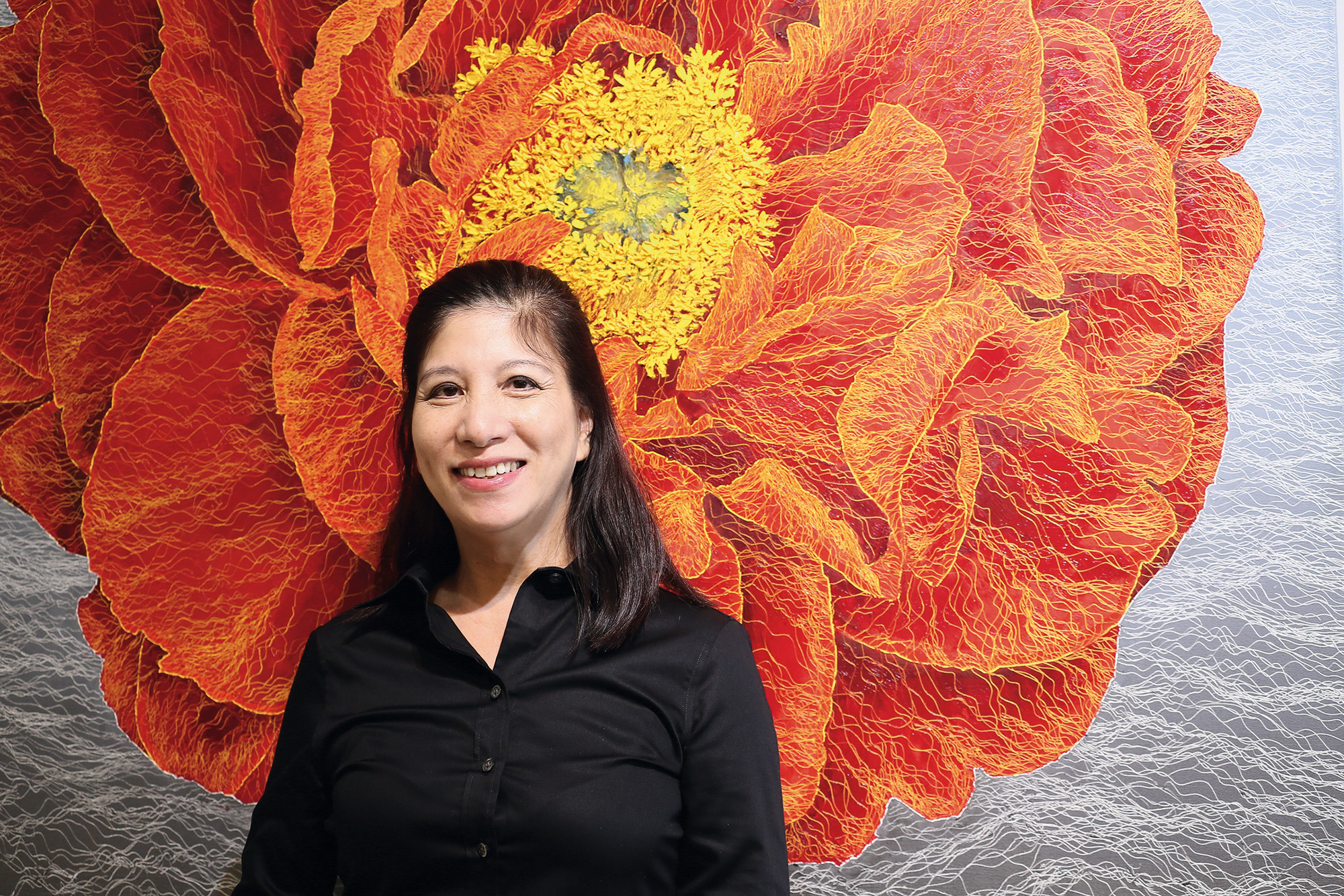 創作能量充沛的鄭麗雲,跳出框架,從巨幅油畫、橢圓形畫框,2014年創作的花系列,更直接以花朵的不規則造型製作木板再裱上畫布,運用她擅長的刮線技巧,勾勒花瓣的紋路。華麗的牡丹、素雅的野薑花、柔美的三色堇等,鄭麗雲用畫筆將她在庭園裡種植的花卉,躍上畫布,飽滿而活潑的色彩,讓觀者感受女性溫暖堅韌的力量。