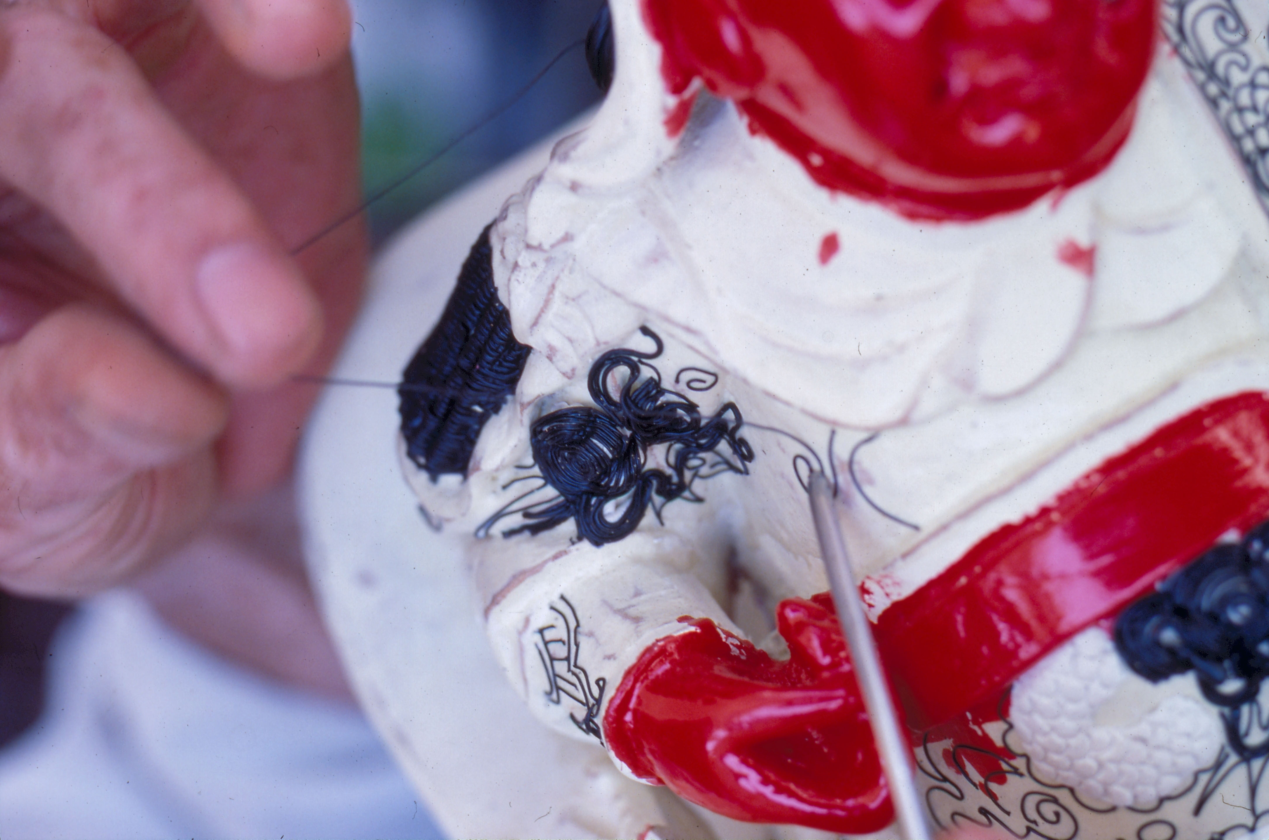 圖2:泉州派「漆飾」做法。左手拉漆線,右手執工具,將線按壓於龍袍、戰甲的突紋上。(楊永山/漢聲雜誌)
