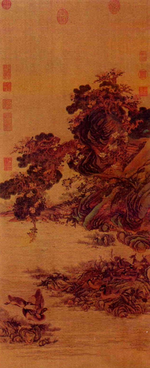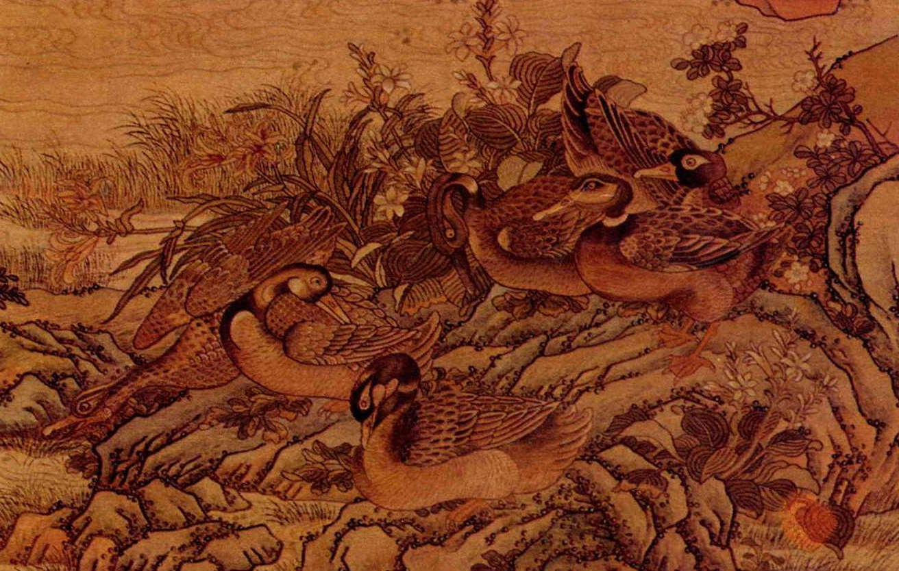 春溪浴鴨圖,便是清代極精緻的緙絲作品。圖長106.7公分,寬45.8公分,其中每方寸之間,約有經線100條,緯線300條。坡上的雜草、松樹、松針和水草,都有添筆,而細緻縝密的花卉、鴨毛、水波,則是緙織最見工夫之處。