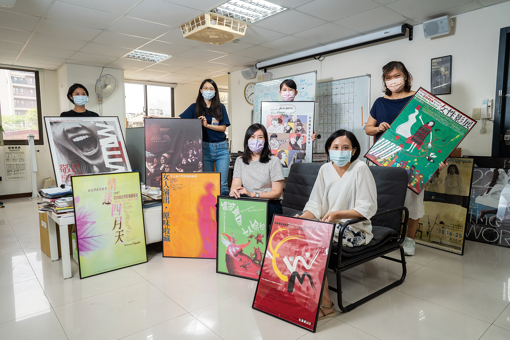 回顧女影歷屆海報,羅珮嘉(前排左)與團隊持續推出引領潮流的影展,拓展觀眾對電影的想像。(林旻萱攝)