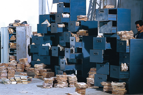 台北市民大道與建國北路交接口的閒置汽車工廠,被陳界仁借來權充《軍法局》的片廠,空盪、灰塵滿天的空間裡佈置了舊檔案櫃、文件、大型鐵皮屋等。在歸還工廠前,6月這天陳界仁召集了演員與工作團隊前來拍攝劇照。