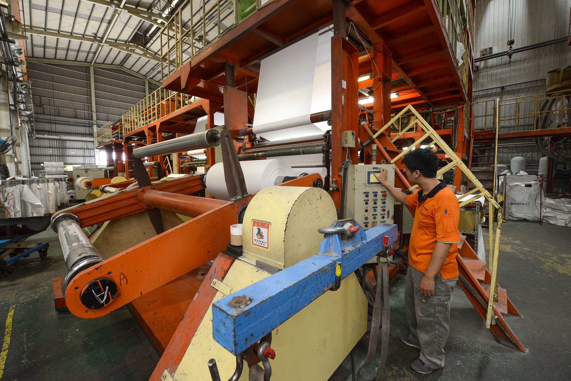 龍盟科技四千多坪廠區,堆滿了一捆捆的紙軸,亮白色澤透著一絲灰色;走近一看,廠區不見傳統紙廠充滿紙漿、蒸氣的環境,取而代之的是一袋袋細粉狀的石頭粉,準備和PE塑膠原料融合,製成紙張。每年從龍盟出產的石頭紙張,就有一萬多噸。